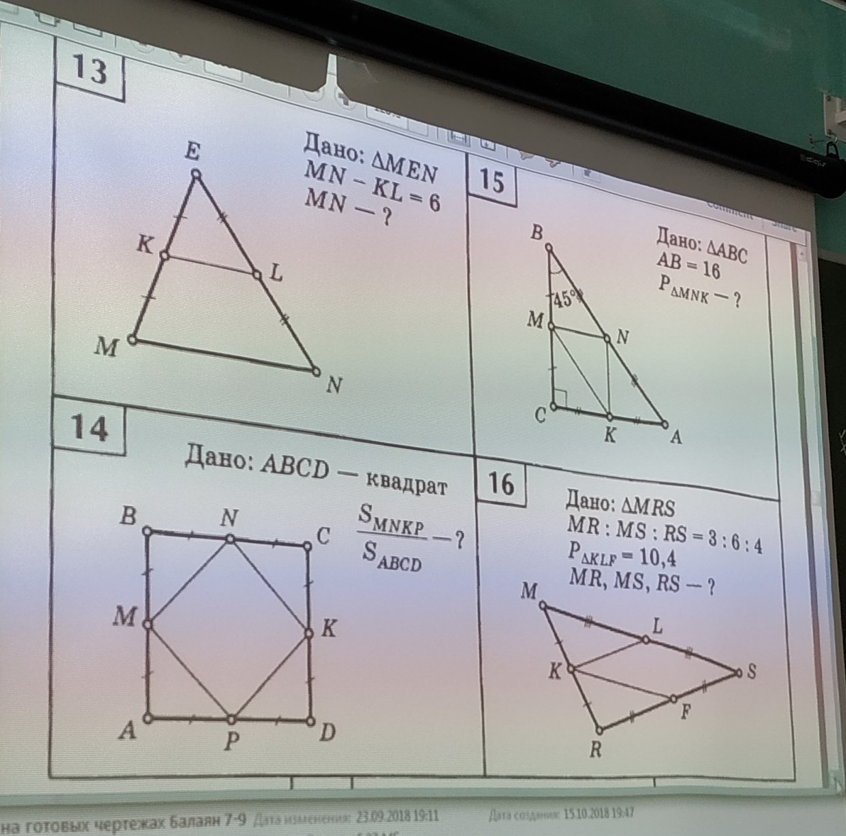 14) ABCD- квадрат, который состоит из 4 треугольников, которые равны (все углы по 90 и по 2 стороны равны). Значит MNKP - тоже квадрат. Если продлить треугольники до квадратов, то ты увидишь, что он (MNKP) состоит из 4 треугольников. Следовательно ABCD состоит из 8 треугольников. Так как MNKP состоит ровно из половины всех треугольников, значит он в 2 раза меньше ABCD. Значит их площади относятся как 1:2