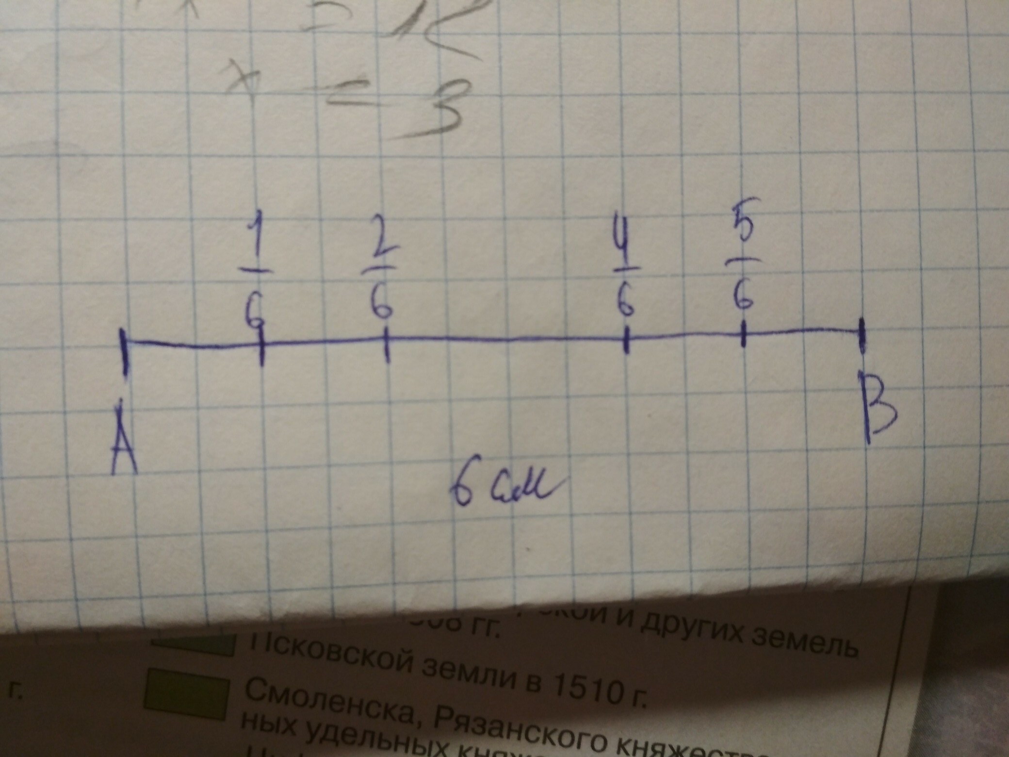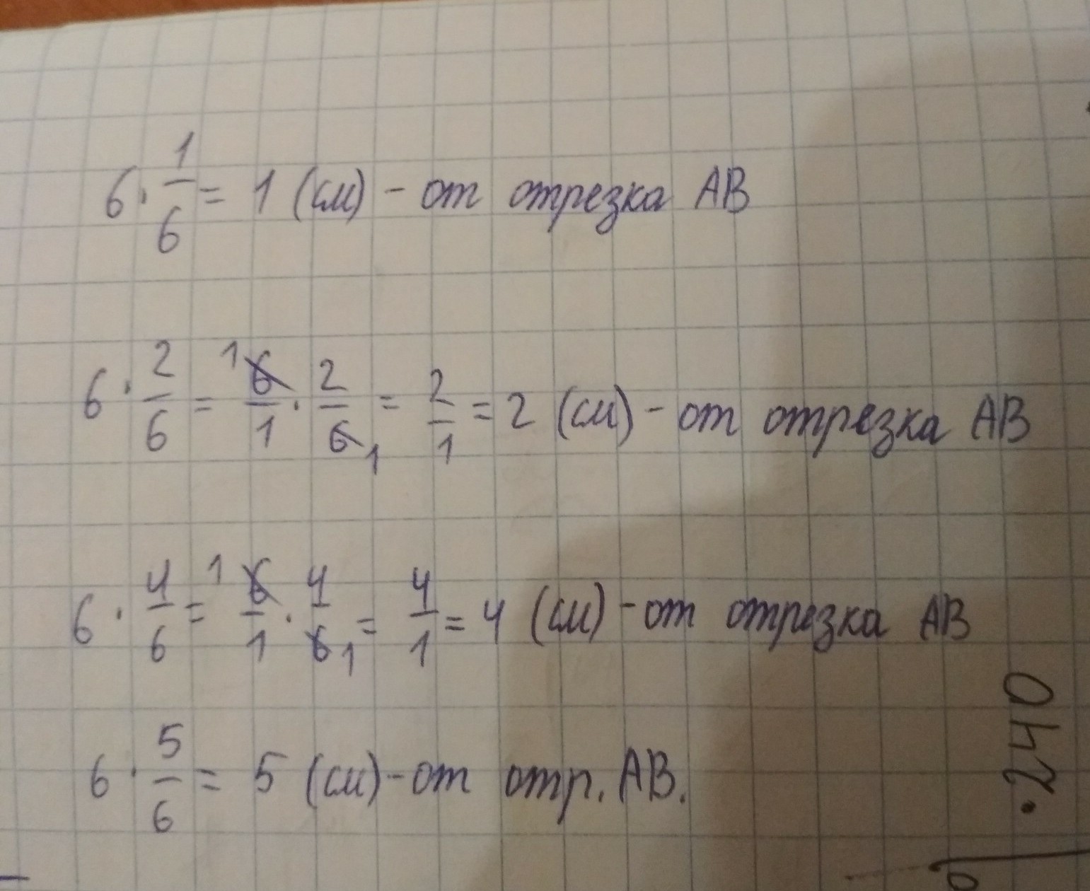 Начерти отрезок AB=6см. Затем начерти отрезки, длина которых состовляет одну шестую, две шестых, четыре шестых, пять шестых длины отрезка AB.(подсказка это дроби кто не понял)