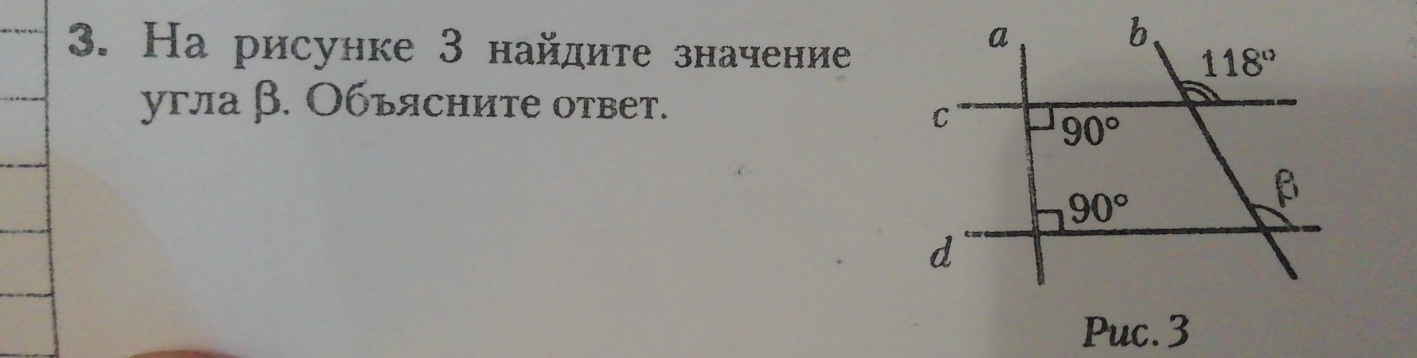 Угол между прямой a и прямой c равен углу между прямой a и прямой d, равен 90°. Накрест лежащие углы в данном случае тоже будут равны 90°, следовательно прямая с параллельна прямой d. Исходя из этого угол β будет равен 118°.