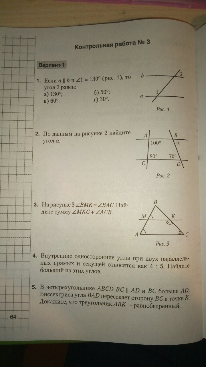 3).из условий задачи следует, что MK и AC параллельны, следовательно углы MKC и ACB смежные и в сумме равны 180 град.