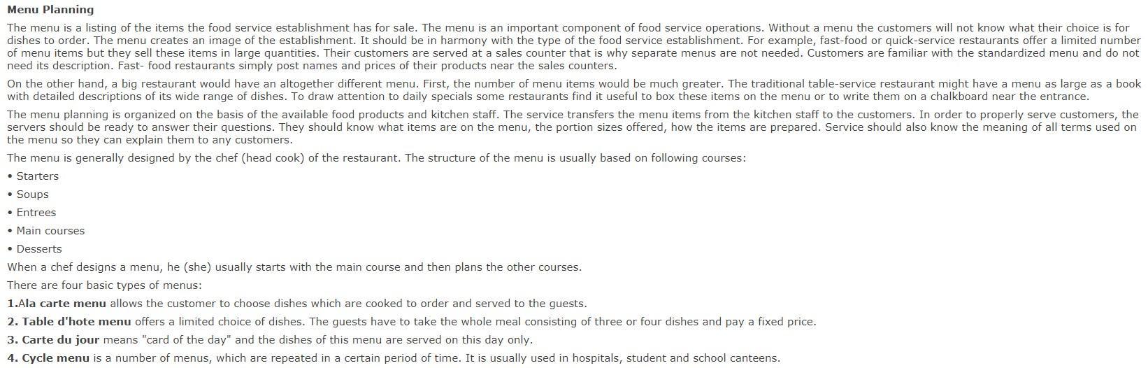 предприятия общественного питания; важный компонент обслуживания; создаёт представление (имидж), ресторан бытрого обслуживания, ограниченное количество блюд в меню, традиционный ресторан с обслуживанием столов, детальное описание, привлечь внимание, блюдо дня, имеющиеся в распоряжении продукты питания, работники кухни, чтобы надлежащим образом обслуживать гостей, шеф-повар разрабатывает меню, обслуживающий персонал