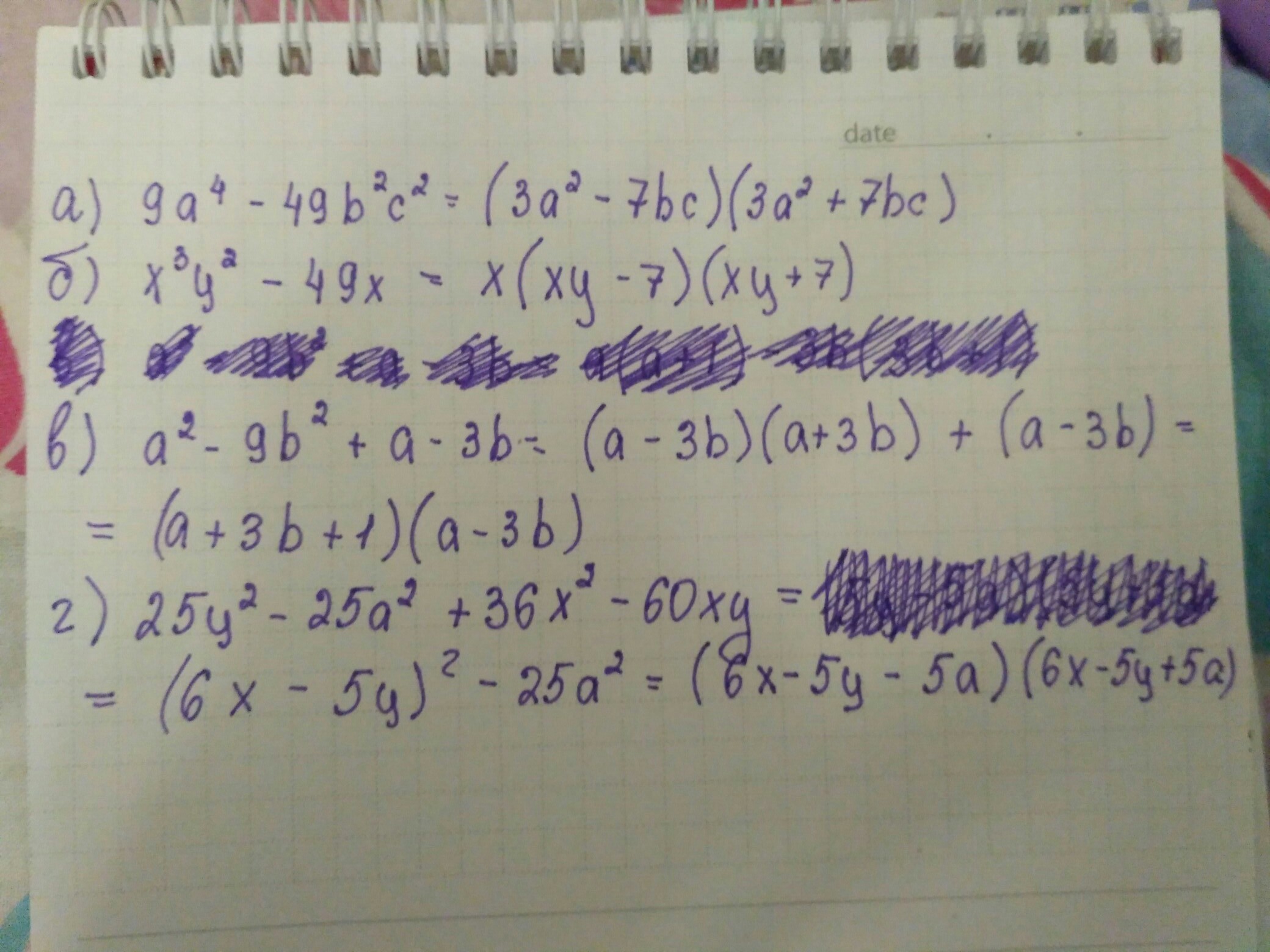 г)(5у)²-2*5*6ху+(6х)²-25а²=(5у-6х)²-(5а)²=(5у-6х-5а)(5у-6х+5а)-квадрат разности и разность квадратов