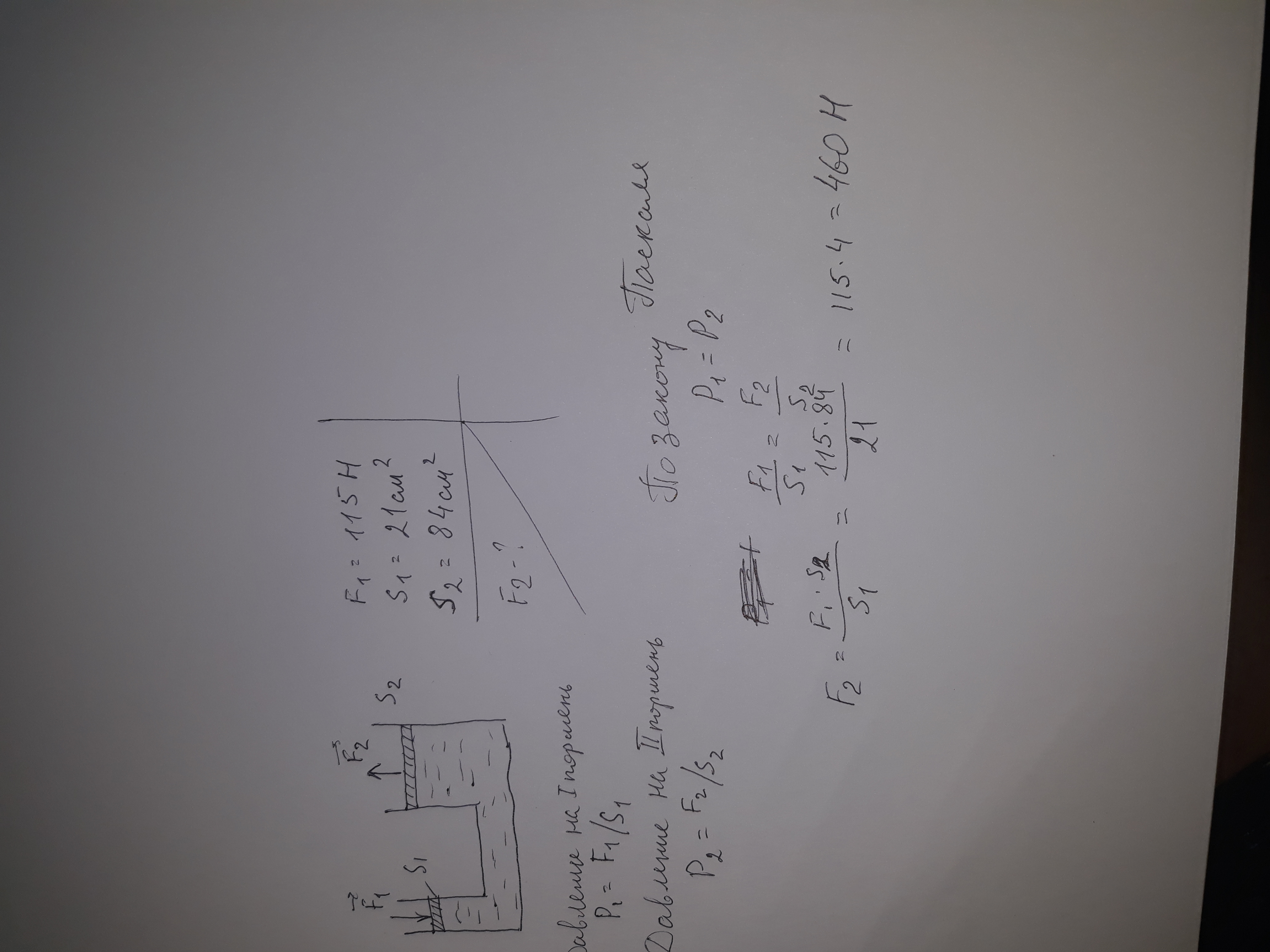 F1/S1=F2/S2; F2=F1×S2/S1 = 115×84/21 =460Н
