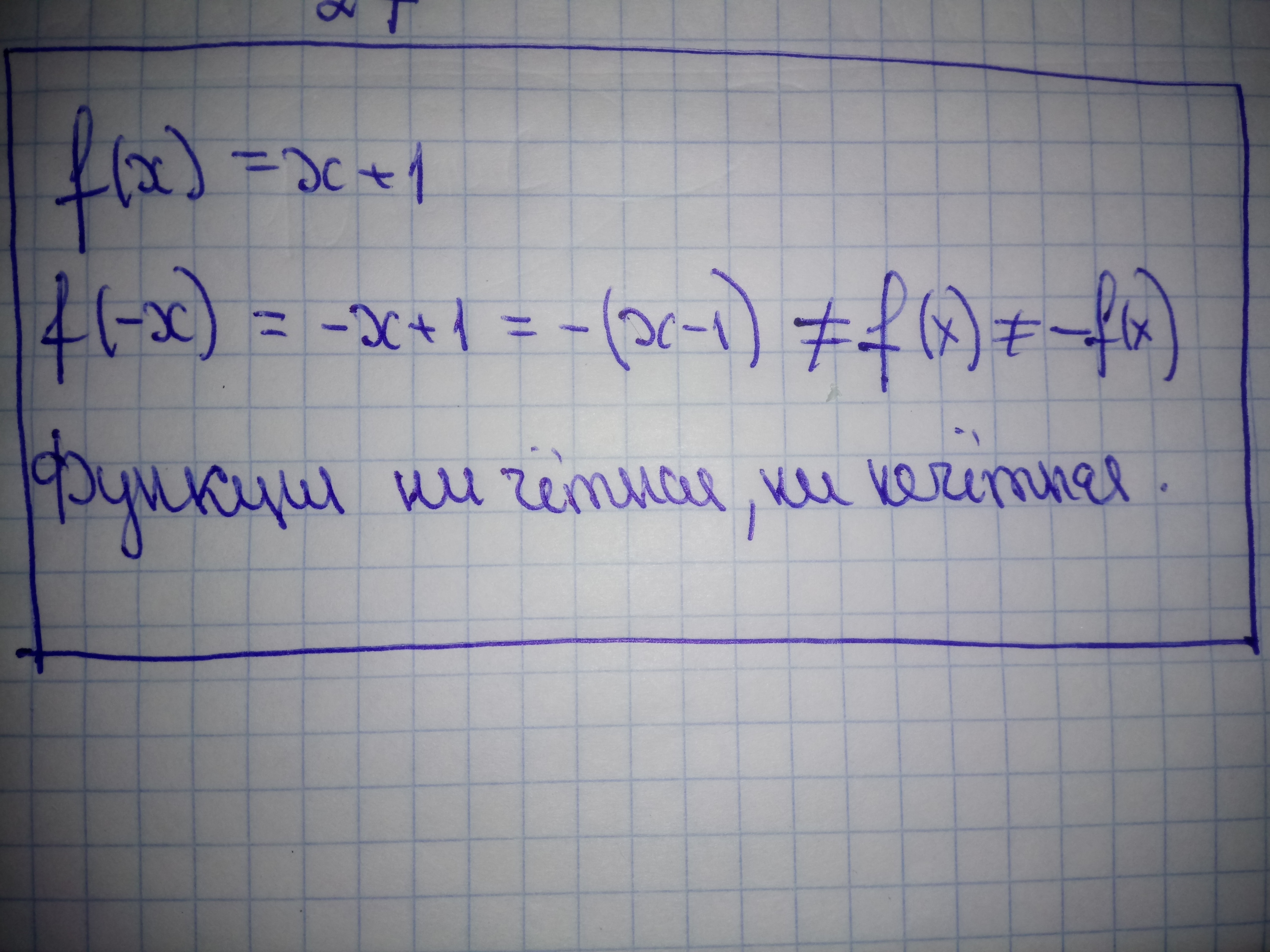 Установите, является ли функция f(x)=x+1 четной, нечетной или не является ни четной, ни нечетной. C решением!
