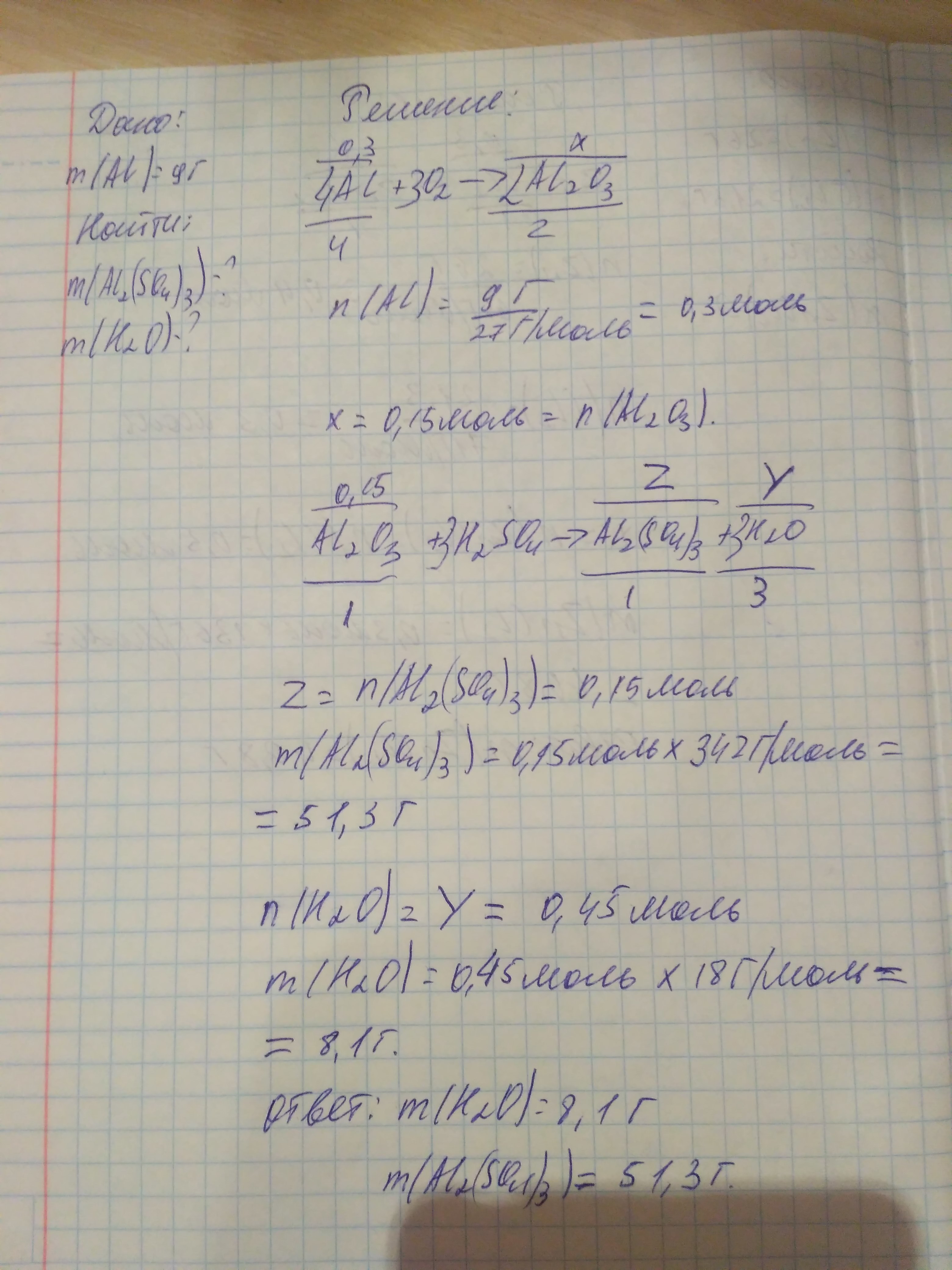 Алюминий массой 9 г подвергли окислению под действием кислорода воздуха. Полученный оксид растворили в серной кислоте. Найдите массу соли и воды, которые образовались в последней реакции.