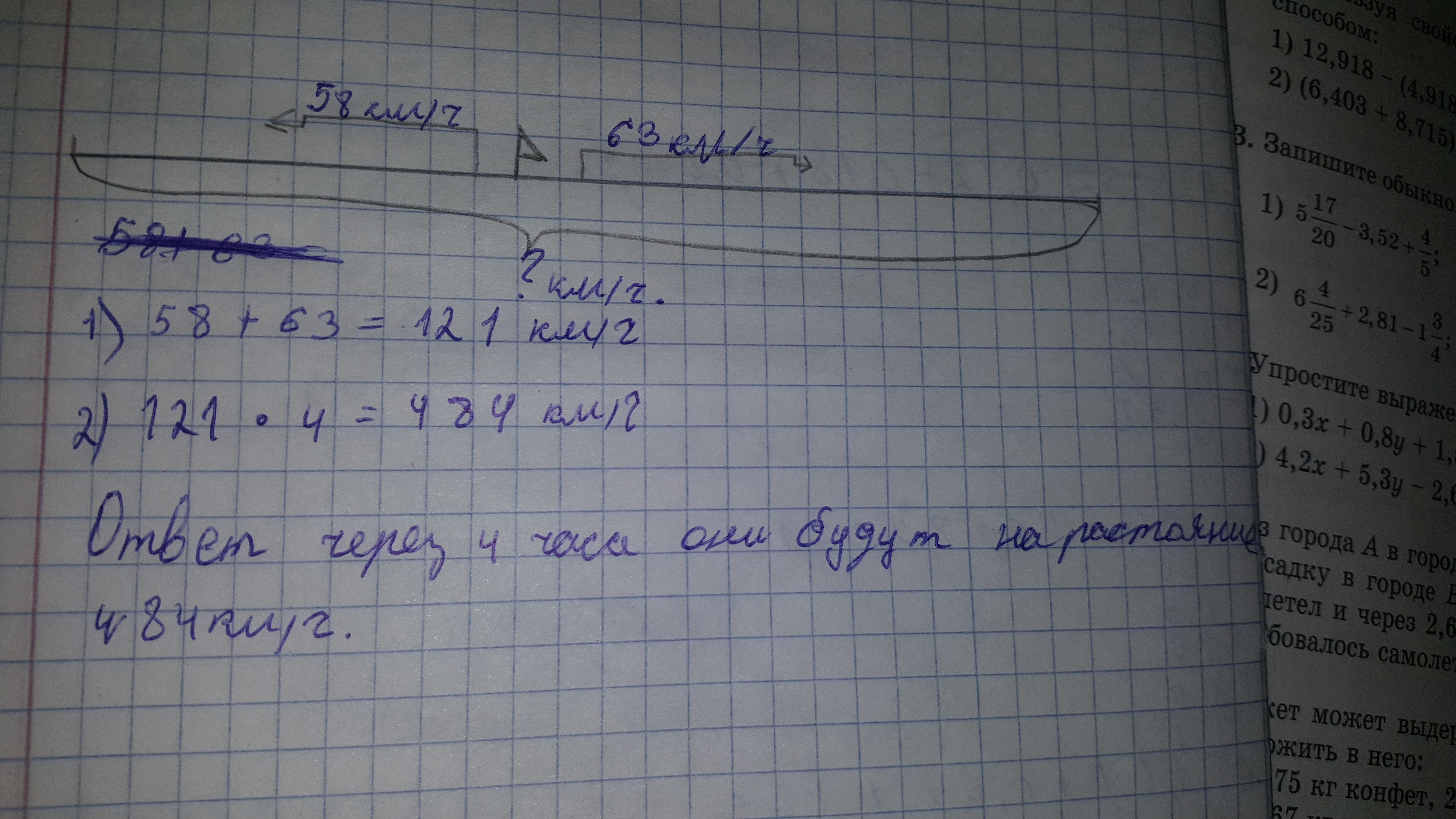 из одного города одновреммено в провотиположные направления вышли 2 автобуса скорость первого бвла 58 км/ч а скорость 2 63 км/ч на каком растояние автобусы через 4 чама реши с чертежнм