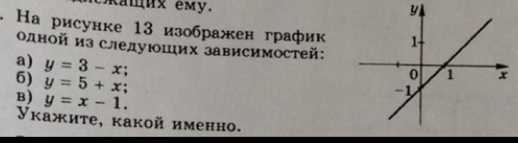 На графике изображено в)y=x-1.Так как ноль функции по оси ох в точке 1,а 1-1=0.По оси оу ноль функции в точке -1.Если мы приравняем у к 0 то получится -1