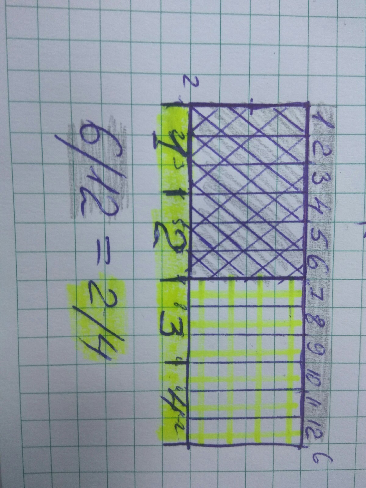 начертите в. тетради прямоугольной со сторонами 2 см и 6 см ,разделите его на 12 равная частей .покажите с помощью рисунка,что верно равенств;в)6/12=2/4.