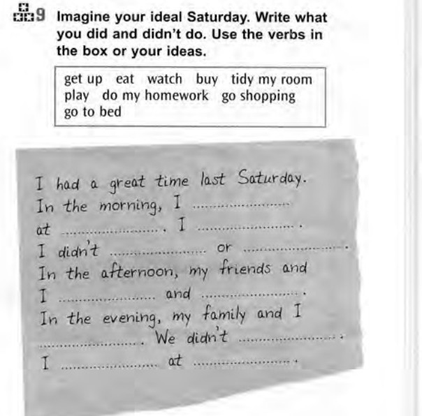 I got up at 10 o'clock. I played computer games. I didn't do my homework or tidy my room. In the afternoon, my friends and I went shopping and bought some clothes. In the evening, my family and I ate dinner. We didn't watch TV. I went to bed at 11 o'clock.