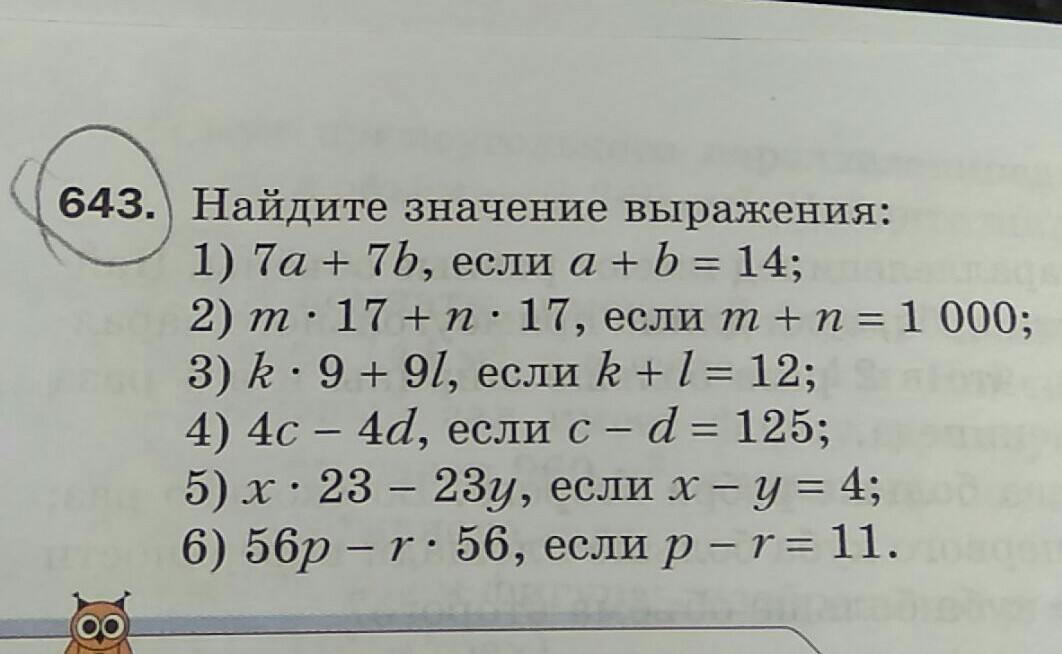 1)7(a+b)=7*14=98; 2)17(m+n)=17000;3)9(k+l)=108;4)4(c-d)=500;5)23(x-y)=4*23=92;6)56(p-r)=56*11=616
