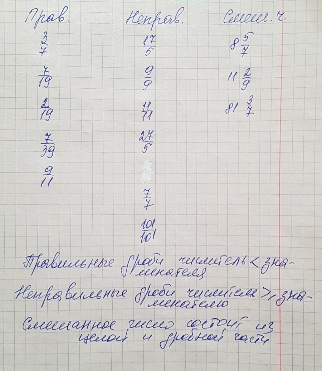записать в три столбика правильные дроби неправильные дроби смешанное число 17/5 9/9 3/7 8 5/7 11 2/9 11/11 7/19 27/5 9/11 7/7 81 3/7 2/19 101/101 7/39