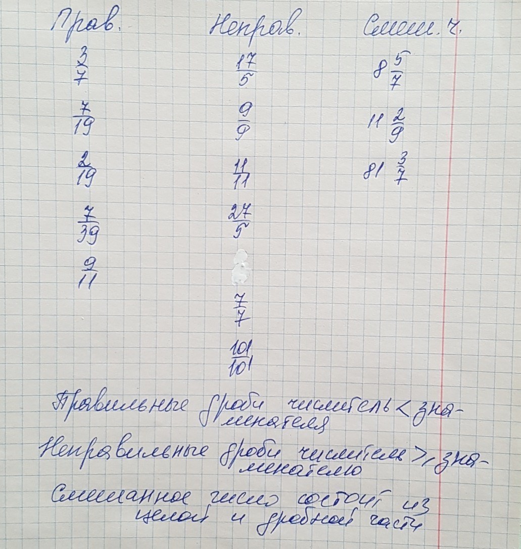 записать в три столбика правильные дроби неправильные дроби смешанное число 17/5 9/9 3/7 8 5/7 11 2/9 11/11 7/19 27/5 9/11 7/7 81 3/7 2/19 101/101 7/39