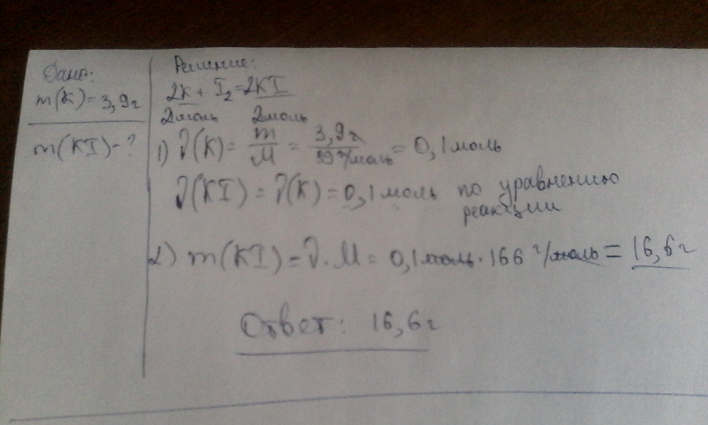 m(KI) = n × M = 0.1 моль × 166гмоль = 16.6г