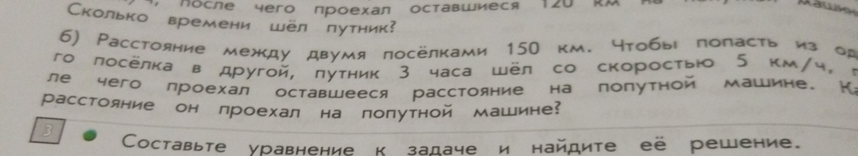 1)5умножить на 3 равно 15(км) он прошел 2)150минус 15 равно 135(км) он проехал на мошине