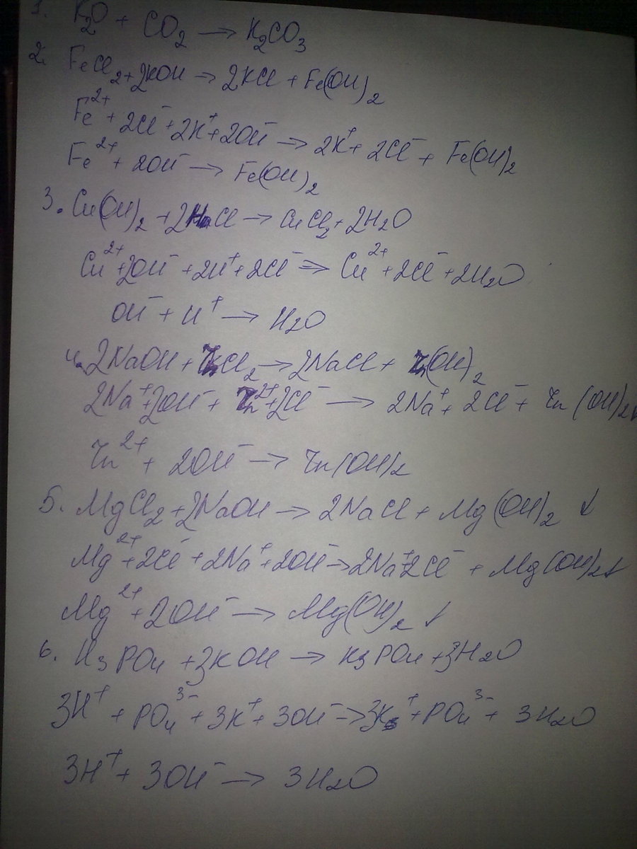 заПИШИТЕ МОЛЕКУЛЯРНЫЕ И ИОННЫЕ УРАВНЕНИЯ РЕАКЦИЙ ,ХАРАКТЕРНЫЕ ДЛЯ ОСНОВАНИЙ ,ИСПОЛЬЗУЯ СЛЕДУЮЩИЕ СХЕМЫ ? + СО2 → К2СО3+? б) FеСI2 + КОН → ?+? в) ? + Сu (ОН)2 →СuСI2 +? г) ?+? →NаСI+? д) МgСI2+?→Мg(ОН)2+? е) Н3РО4+?→К3РО4+?