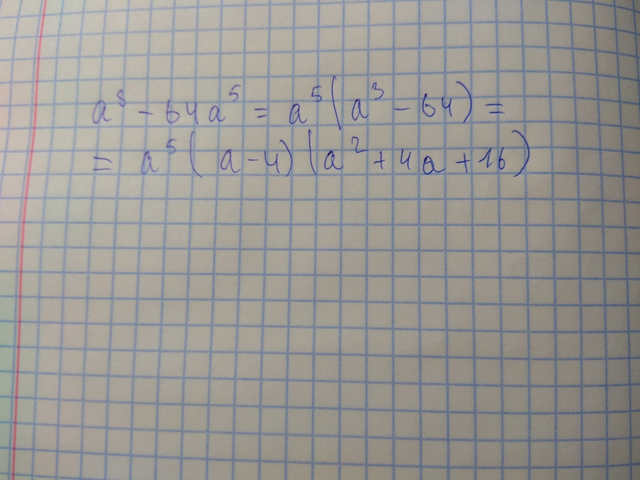 а в 5 степ×(а в куб.-64)=а в 5 степ.×а в куб-4 в куб)=а в 5 степ.×(а-4)×(а в кв.+4а+16)