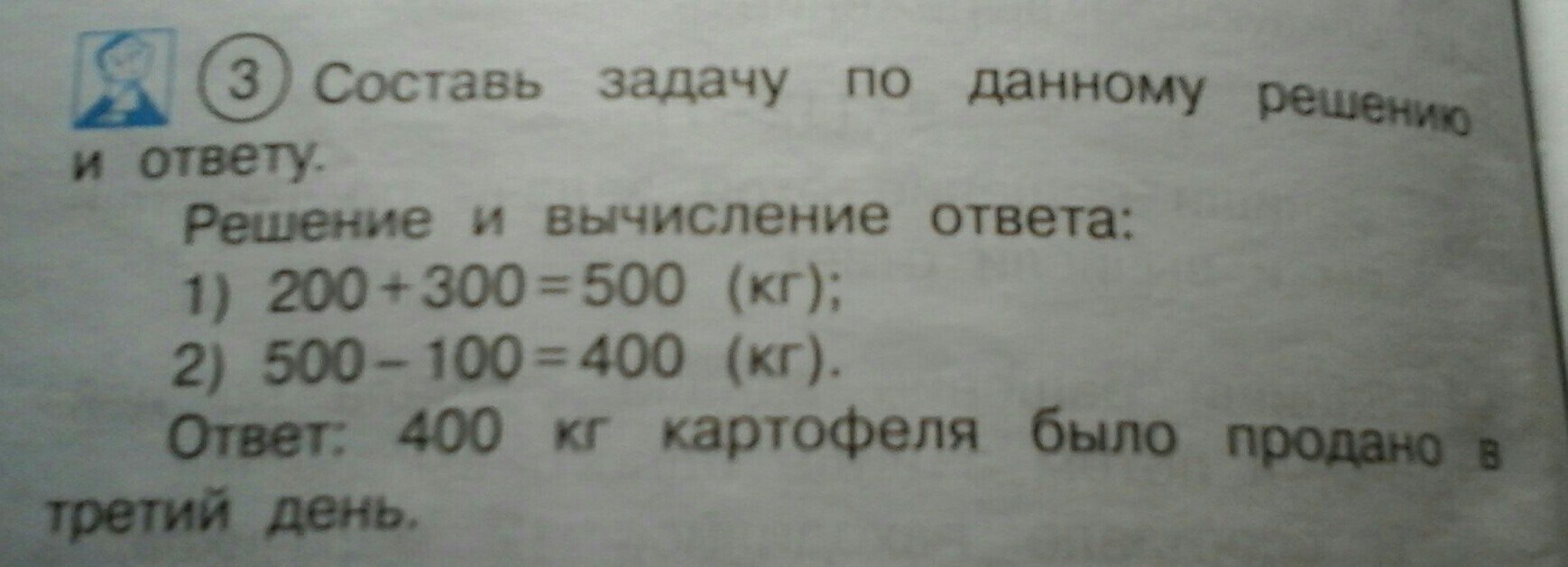 В магазин привезли картофель. В первый день продали 200кг. Во второй на 300кг больше, чем в первый день. В третий день на 100кг меньше чем в первый и во второй день вместе. Сколько картофеля было продано в третий день?