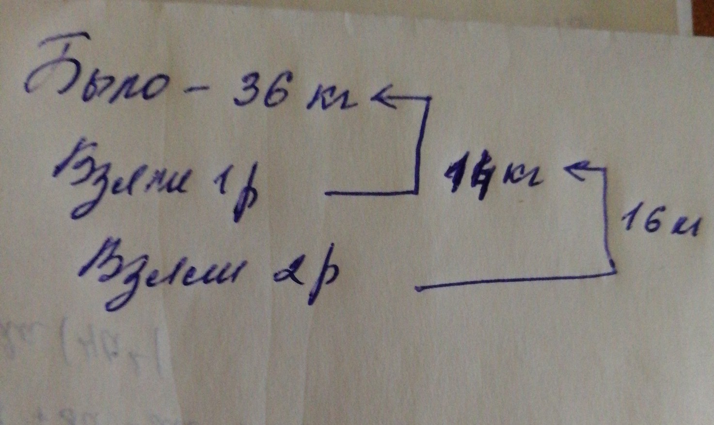 В мешке было 36 кг сахара.Из мешка сеачала взяли 14 кг сахара,потом ещё 16 кг.Сколько килограммов сахара взяли из мешка?Построй схему и реши задачу.Вычисли ответ.