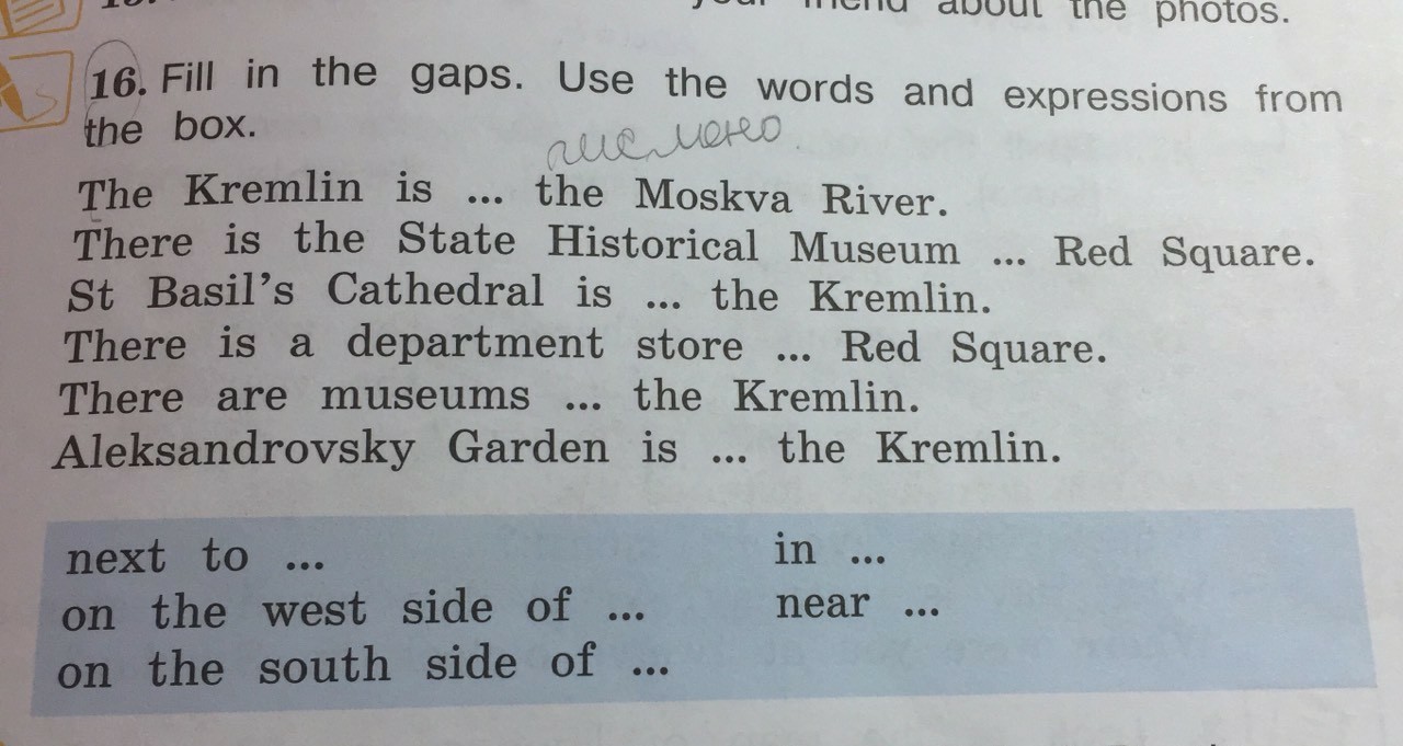 16. Заполните пропуски. Используйте слова и выражения из окна Кремль .. Москва-река. Здесь находится Государственный исторический музей. Красный квадрат. Храм Василия Блаженного это .. Кремль. Есть универмаг Красная площадь. Есть музеи в Кремле, Александровский сад. Кремль рядом с. на западной стороне на южной стороне в ближнем