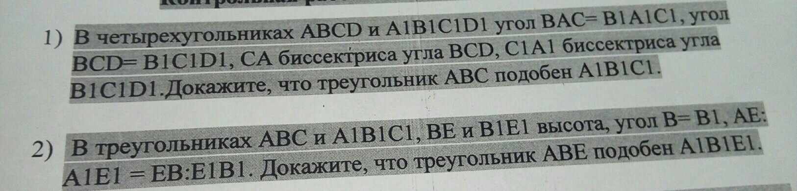 1. В ΔΔ АВС и А₁В₁С₁ равны углы ВАС и В₁А₁С₁, а углы ВСА и В₁С₁А₁ равны половине равных углов ВСД и В₁С₁Д₁ Поэтому ΔАВС и ΔА₁В₁С₁ подобны по двум равным углам