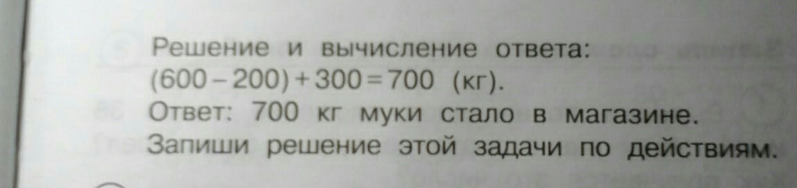в магазине было 600 кг пшеничной и 300 кг ржаной муки. за день продали 200 кг пшеничной муки. Сколько всего муки стало в магазине?