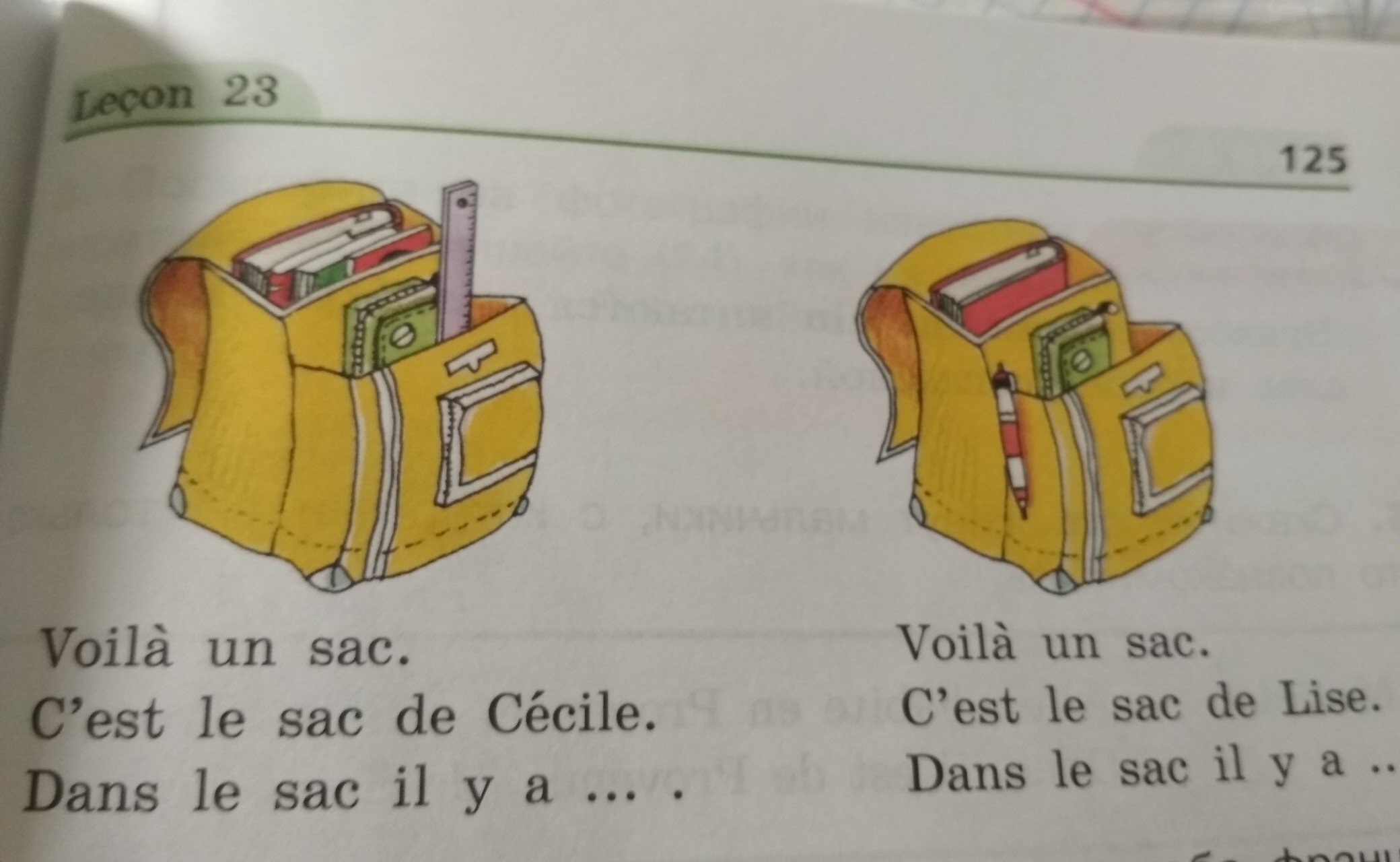 Dans le sac il a y des livres, une règle, un livret scolaire, un plumier.