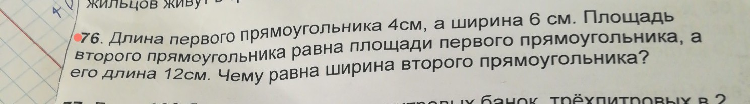 Длина первого прямоугольника 4 см а, ширина 6 см, площадь второго прямоугольника равна площади первого прямоугольника, а его длина 12 см Чему равна ширина второго прямоугольника? Помогите решить по действиям 1 - 4 класс