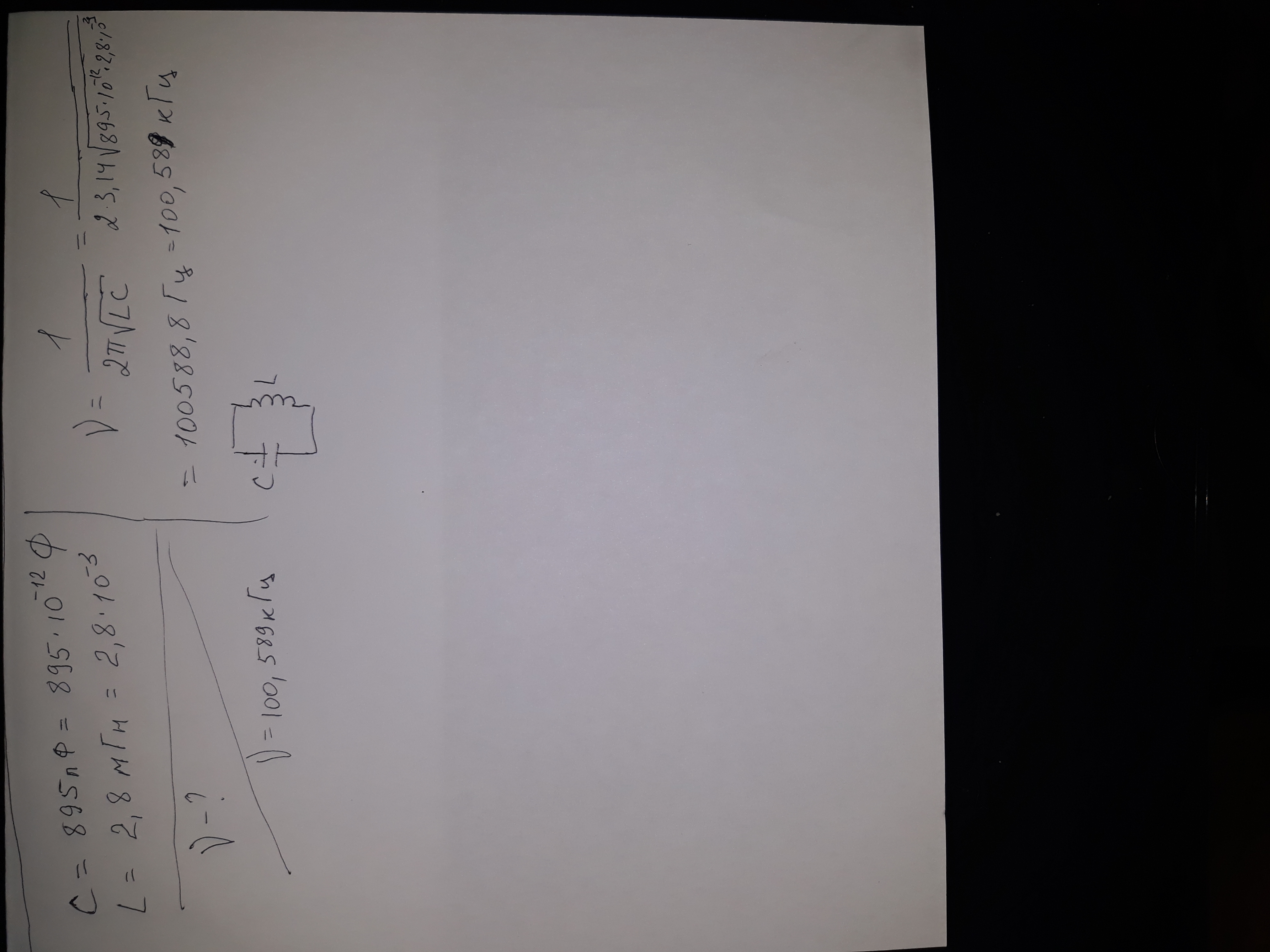 Колебательный контур состоит из конденсатора емкостью 895 пФ и катушки индуктивности 2,8 мГн. На какую частоту настроен контур?