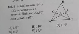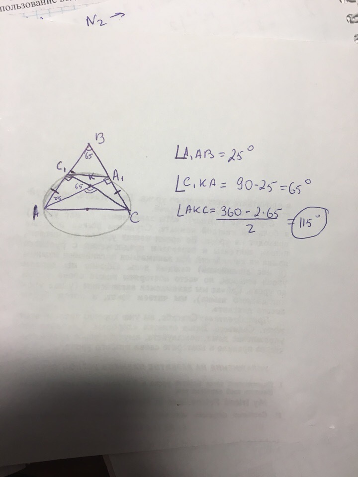 в треугольнике abc высоты AA1 и CC1 пересекаются в точке К Найдите AKC если ABC 65 градусов