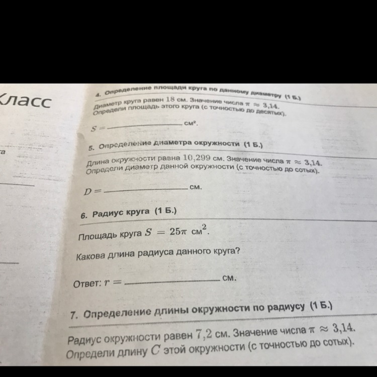 5. L=2pi*r=2pi*(D/2) --> D==10,299/3,14=3,279....=3,28 округлили до сотых.