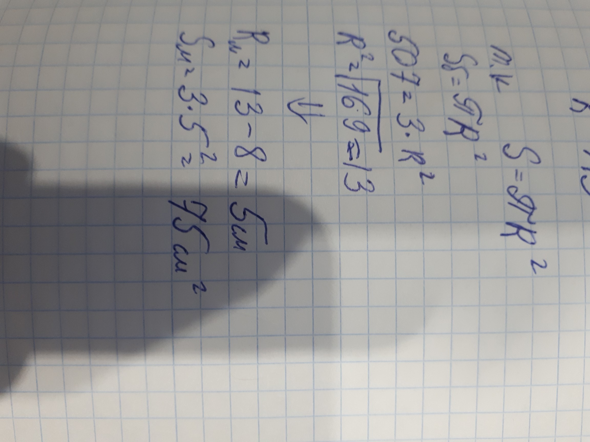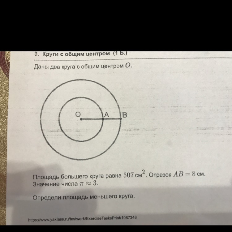 s=пr^2 следовательно нам нужно найти отрезок он же радиус большого круга ОВ. получается: 507= 3*ОВ^2 отсюда ОВ^2= 507/3=169 следовательно ОВ равно корень из 169, это равно 13. Дальше нам нужно определить радиус малого круга, получается 13-8= 5. ну и соответственно площадь малого круга равна ПR^2 получается Sмвлого= 3*5^2= 3*25=75 см^2