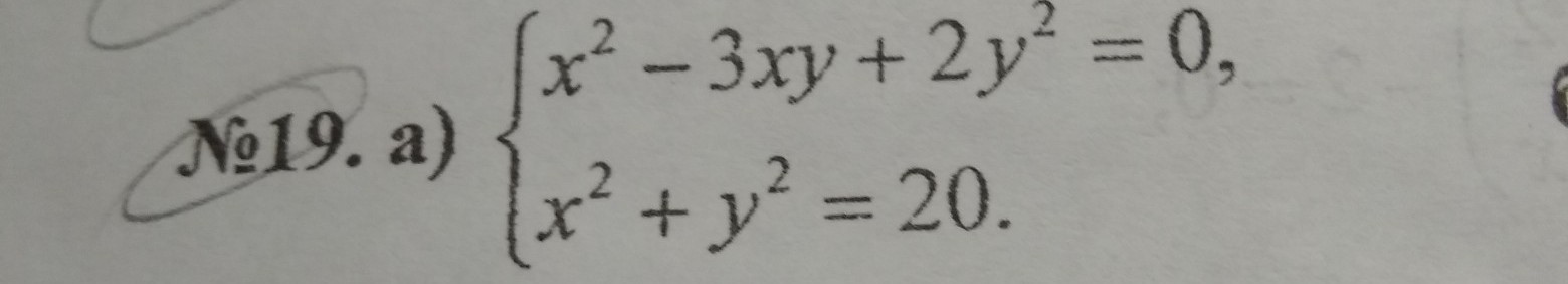 (x² - 2xy + y²) + (y² - xy) = 0; (y - x)² + y · (y - x) = 0 ⇒ (y - x) · (y - x + y) = 0 ⇒ ( y - x) · (2y - x) = 0 ⇒ 1) y - x = 0; y = x Подставим во второе уравнение: x² + x² = 20; 2x² = 20; x² = 10 ⇒ x = ±√10; y = ± √1 ⇒ x = - √10; y = - √10 и x = √10; y = √10 2) 2y - x = 0; x = 2y; Подставим во второе уравнение: 4y² + y² = 20; 5y² = 20; y² = 4 ⇒ y = ± 2; x = ±4 ⇒ x = 2; y = 4 и x = - 2; y = - 4 Ответ: 1) x = -√10; y = -√10 и x = √10; y = √10; 2) x = 2; y = 4 и x = - 2; y = -4