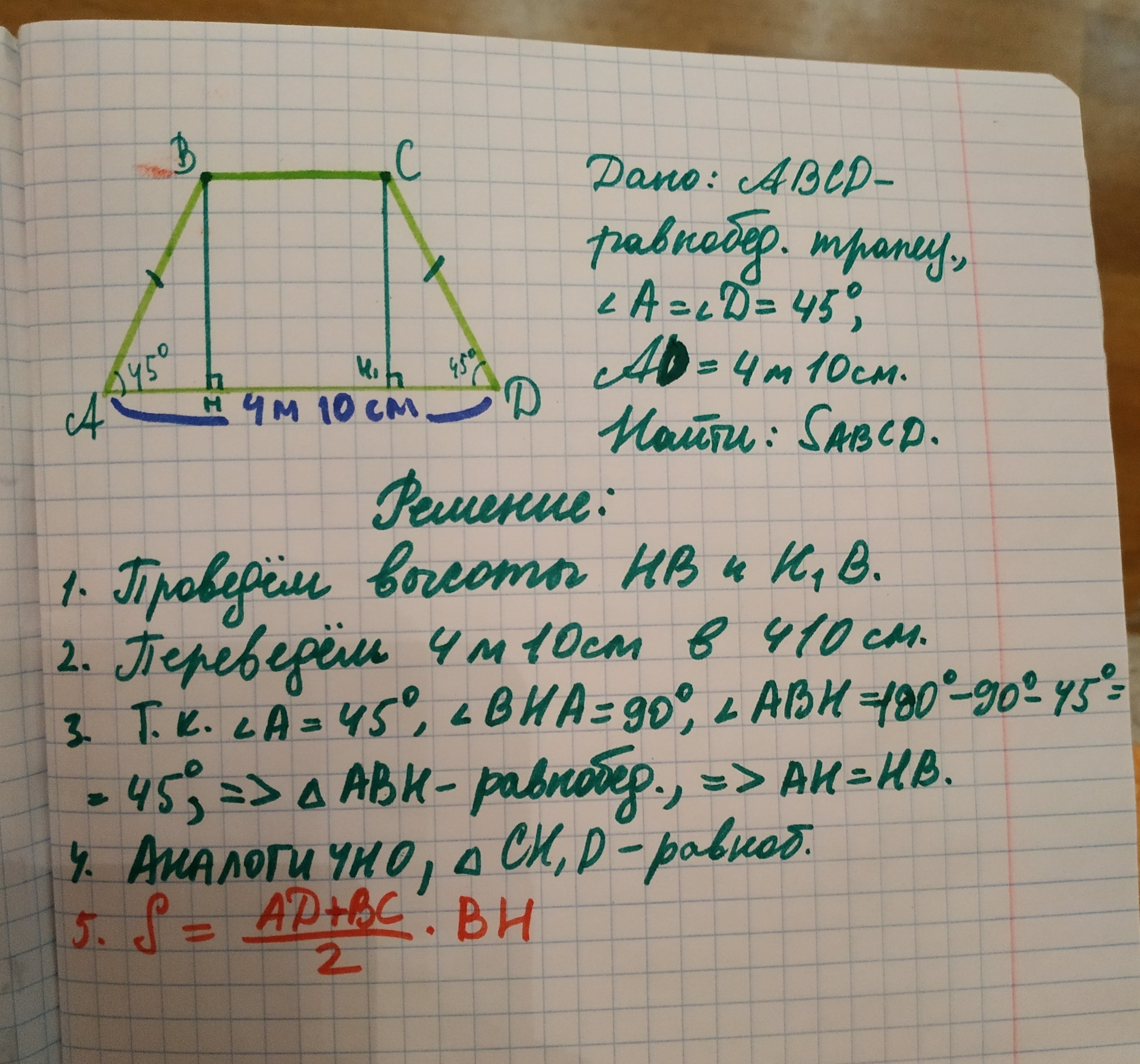 найдите площадь равнобедренной трапеции,если её угрл при основании равен 45, а основания 4м10см