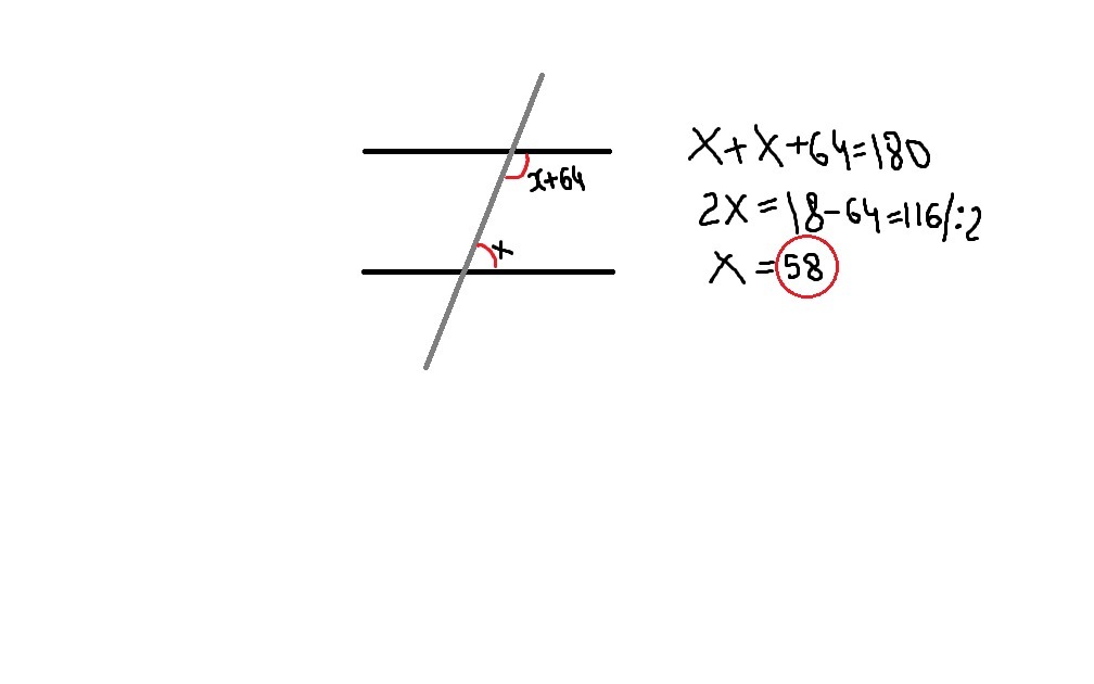 х+х+64=180 (т.к. сумма односторонних углов равна 180 градусов)