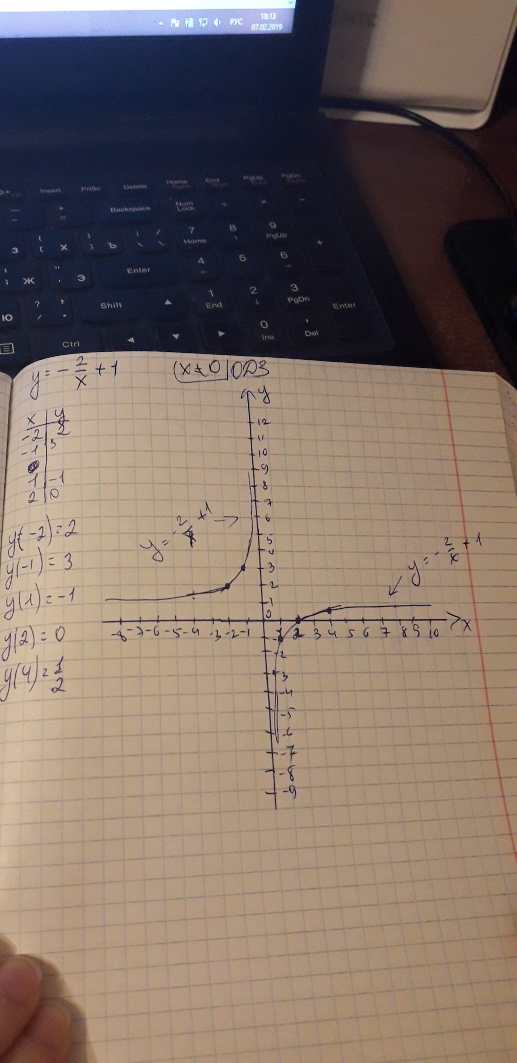 ничего сложного,берете значения х,подставляете в уравнение y=-2/х+1 и находите y.затем отмечаете точки на координатной плоскости и соединяете.вот и график получился.обязательно ОДЗ,потому что деление на переменную.