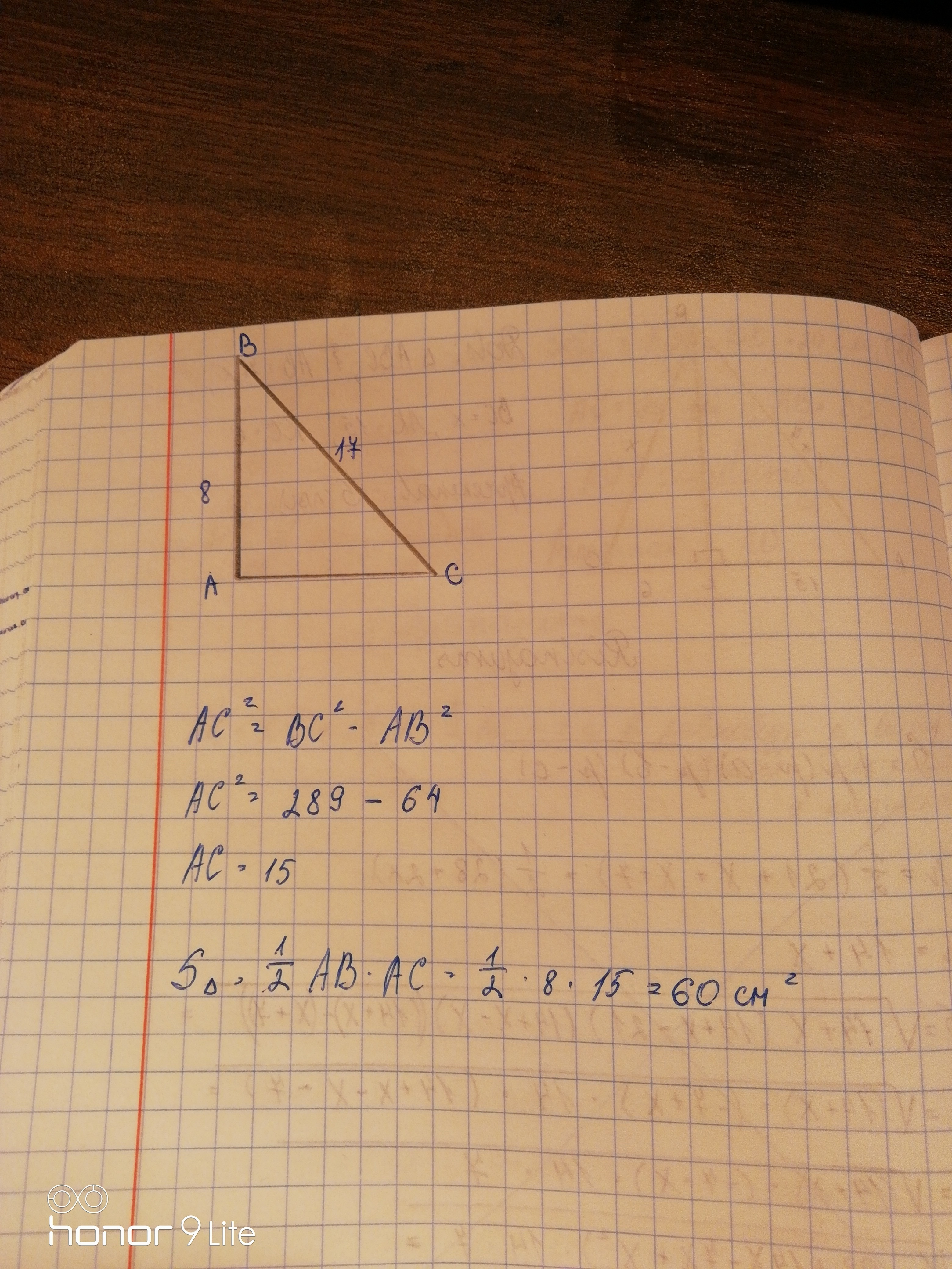 найдите площадь прямоугольного треугольника, если его катет и гипотенуза равны соответственно 8 и 17!!??