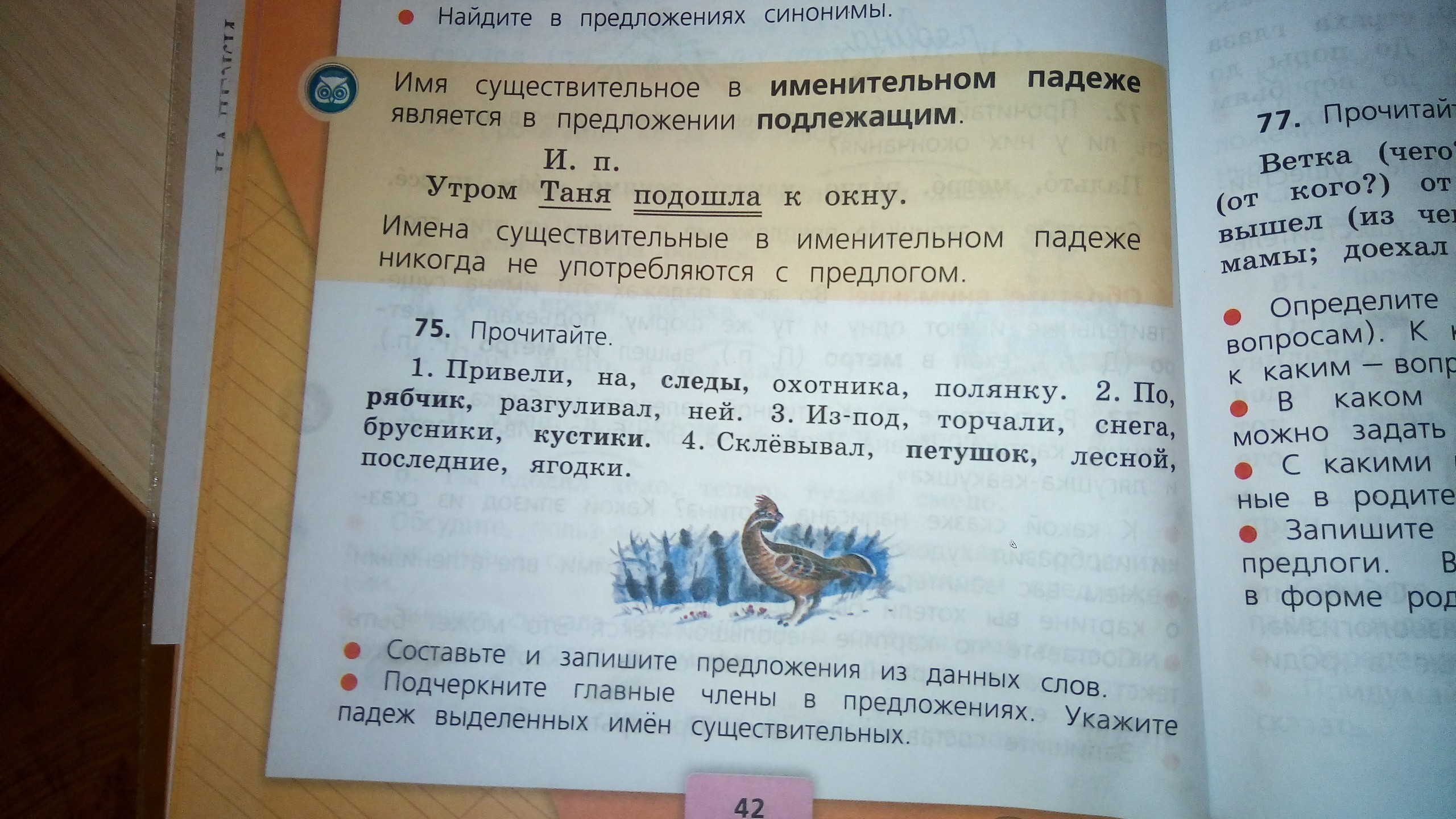 1)Следы привели охотника на поляну. 2)По ней разгуливал рябчик. 3)Из-под снега торчали кустики брусники. 4)Лесной петушок склёвывал последние ягодки.