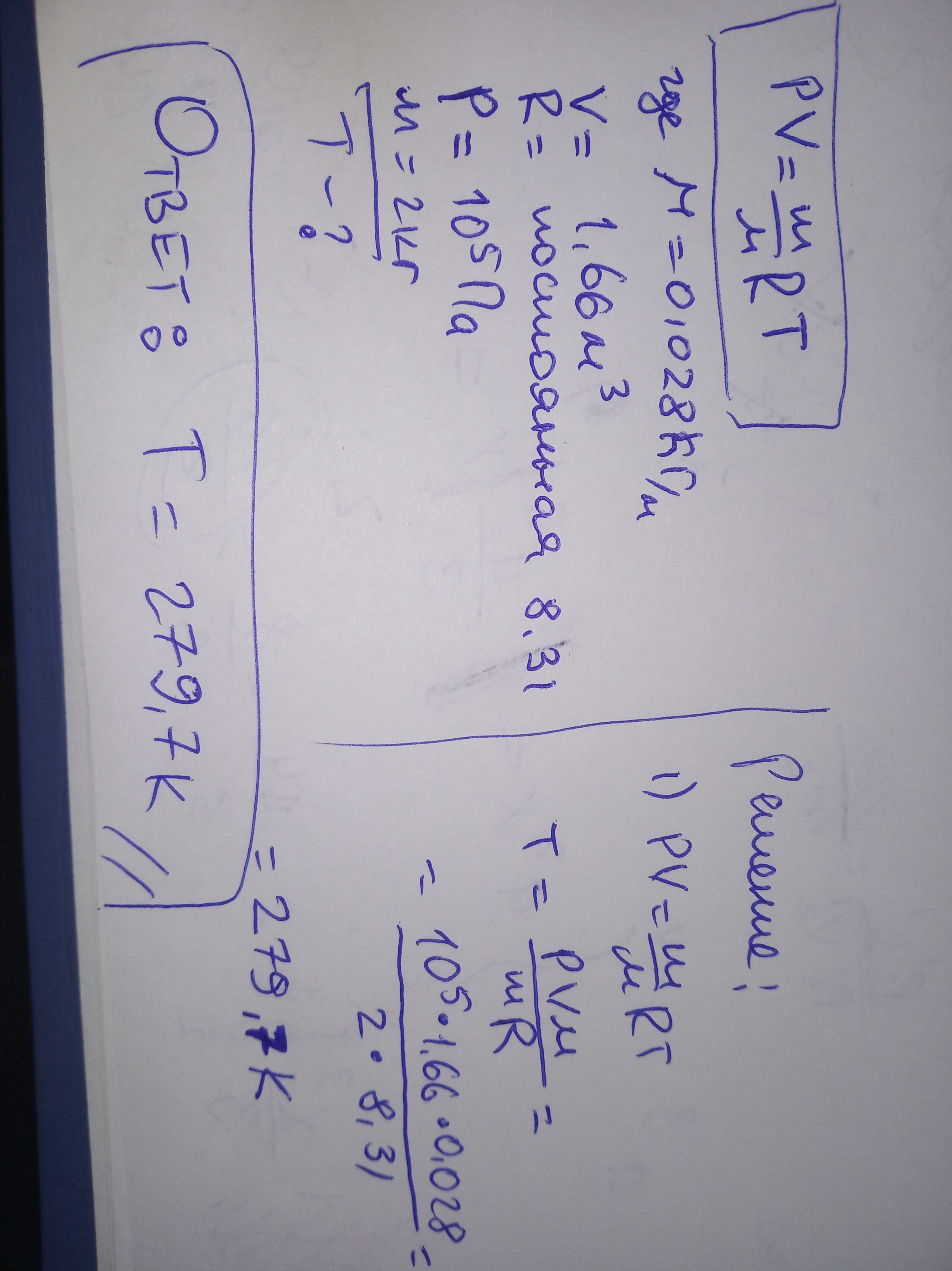 в баллоне объёмом 1.66 м^3 находиться азот 2 кг при давлении 10^5 Па. чему равна температура этого газа?