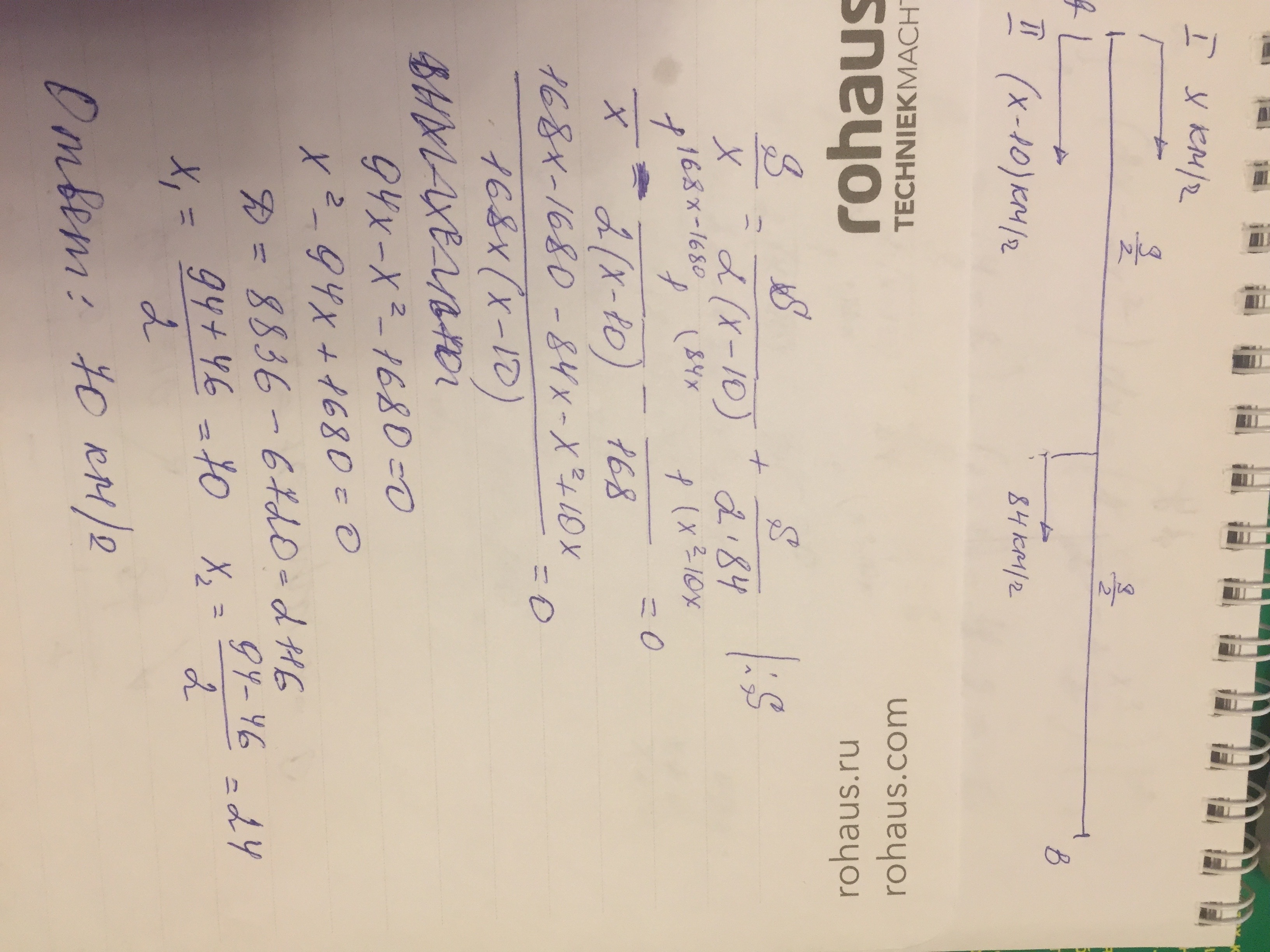 Из А в В одновременно выехали два автомобилиста. Первый проехал с постоянной скоростью весь путь. Второй проехал первую половину пути со скоростью, меньшей скорости первого на 10 км/ч, а вторую половину пути — со скоростью 84 км/ч, в результате чего прибыл в В одновременно с первым автомобилистом. Найдите скорость первого автомобилиста, если известно, что она больше 40 км/ч. Ответ дайте в км/ч.