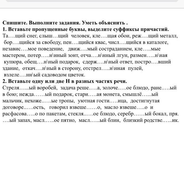 1. Таящий снег, слышащий человек, клеящая обои, режущий металл, борющийся за свободу, пенящийся квас, числящийся в каталоге, независимое поведение, движимый состраданием, потерянный зонт, отчаянный лгун, разменная купюра, обещанный подарок, сдержанный ответ, построивший здание, откаченный в сторону, отстреленная пулей, взлелеянный садоводом цветок.