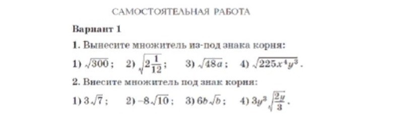 1.1) sqrt{300}  = 10 sqrt{3}  \  :  :  : 2) sqrt{2 frac{1}{12} }  =  sqrt{ frac{1}{6} }  =  frac{1}{ sqrt{6} }  =  frac{ sqrt{6} }{6}  \  :   : : 3) sqrt{48a}  =   sqrt{ {4}^{2} times 3a }  = 4 sqrt{3a}  \  :  :  : 4) sqrt{225 {x}^{4} {y}^{3}  }  =  sqrt{ {15}^{2}  {x}^{4}  {y}^{2}  times y} = 15 {x}^{2} y sqrt{y}