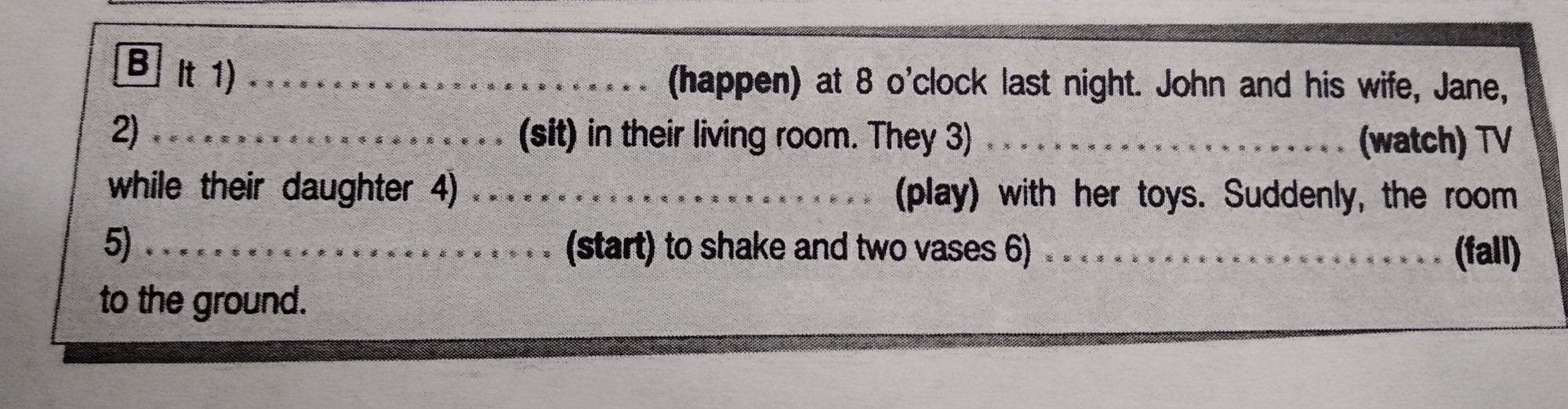 1 - happened, 2 - were sitting, 3 - were watching, 4 - was playing, 5 - started, 6 - fell.