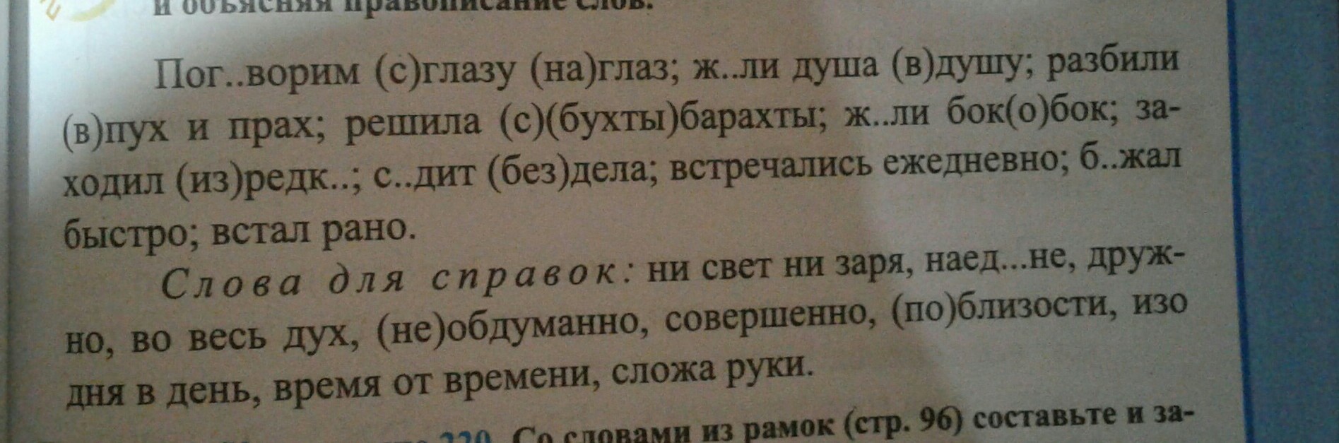 Поговорим с глазу на глаз - наедине; жили душа в душу - дружно; разбили в пух и прах - совершенно; решили с бухты барахты - необдуманно; жили бок о бок - поблизости; заходил изредка - время от времени; сидит без дела - сложа руки; встречались ежедневно - изо дня в день; бежал быстро - во весь дух; встал рано - ни свет ни заря.