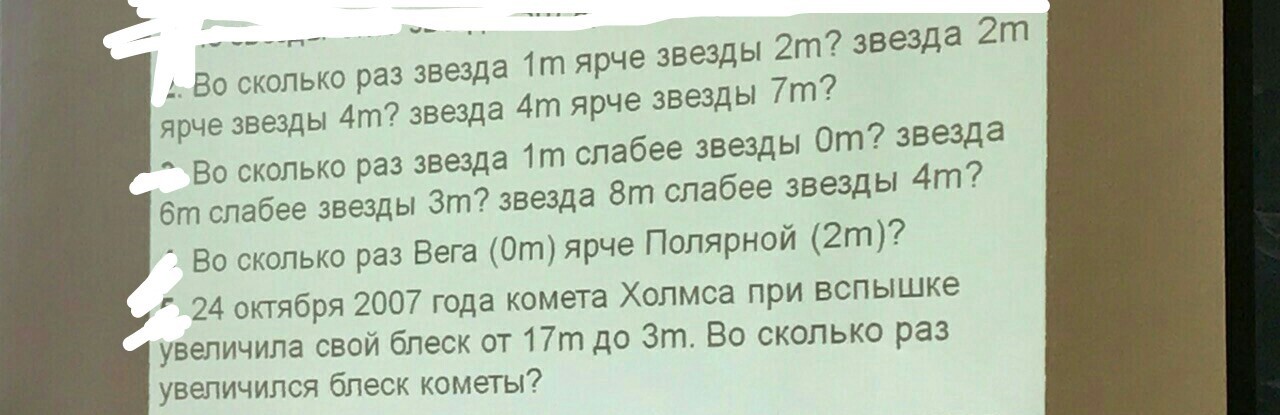 17m - 3m = 14m. Комета Холмса при вспышке увеличила свой блеск в (100^1/5)^14 = 398107,17… раз. Т.е. увеличила свой блеск почти в 400 тысяч раз.