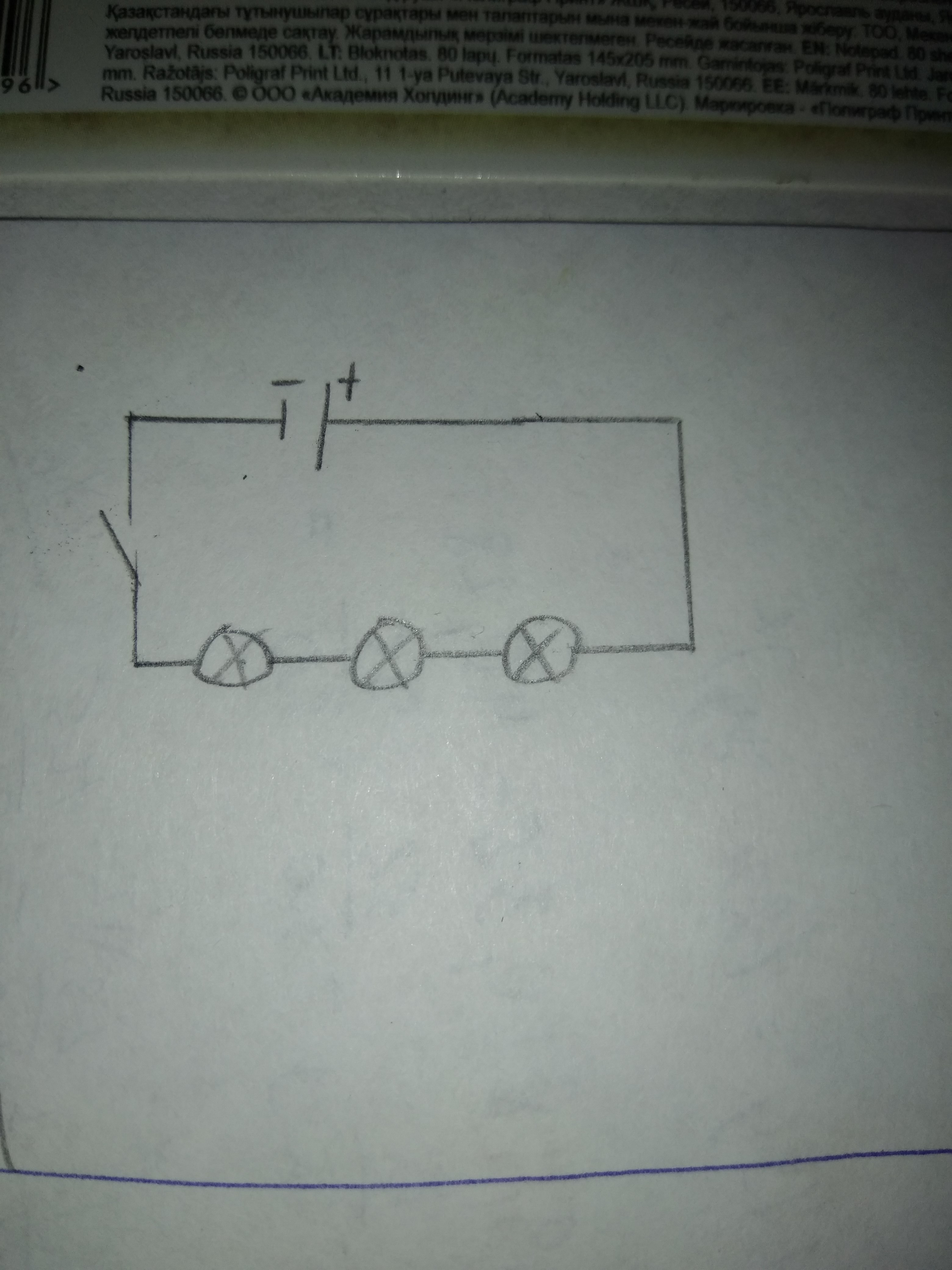 Электросхема, в которой имеются источник тока, три последовательно соединенные лампы и выключатель