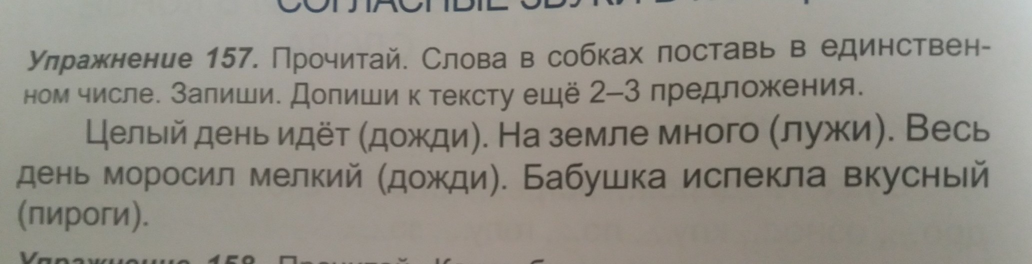 Целый день идёт дождь. На земле много луж. Весь день моросил мелкий дождь. Бабушка испекла вкусный пирог. Я построил дом из песка. Мой друг сделал тюльпан из дерева.