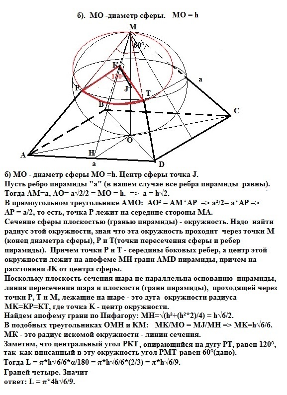 Поскольку плоскость сечения сферы гранями пирамиды не параллельна основанию пирамиды, линия пересечения сферы и плоскости (грани пирамиды), проходящей через точку М, лежащую в центре сферы - это дуга окружности радиуса МР, где точка Р - точка пересечения окружности радиуса h (радиус сферы) с ребром пирамиды АМ (секущая). Так как грани пирамиды - правильные треугольники, а основание высоты пирамиды (точка О) лежит на сфере, то расстояние от центра сферы до точки Р пересечения с ребром пирамиды равно радиусу сферы. Длина дуги РТ равна L= π*r*α/180. r = h, α=60°.