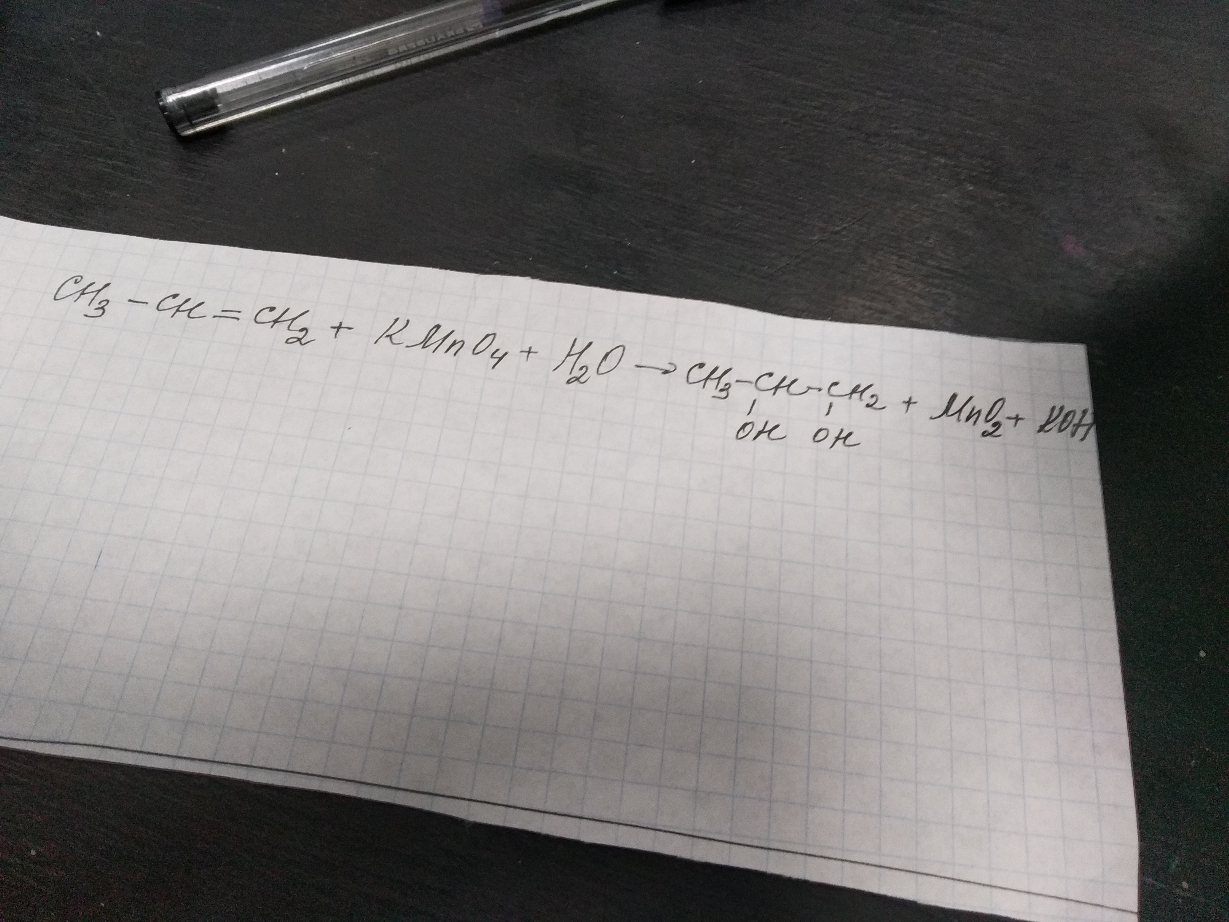 3СН₃-СH=CH₂+2KMnO₄+4H₂O→3CH₃-CH(OH)-CH₂(OH)+2MnO₂+4KOH