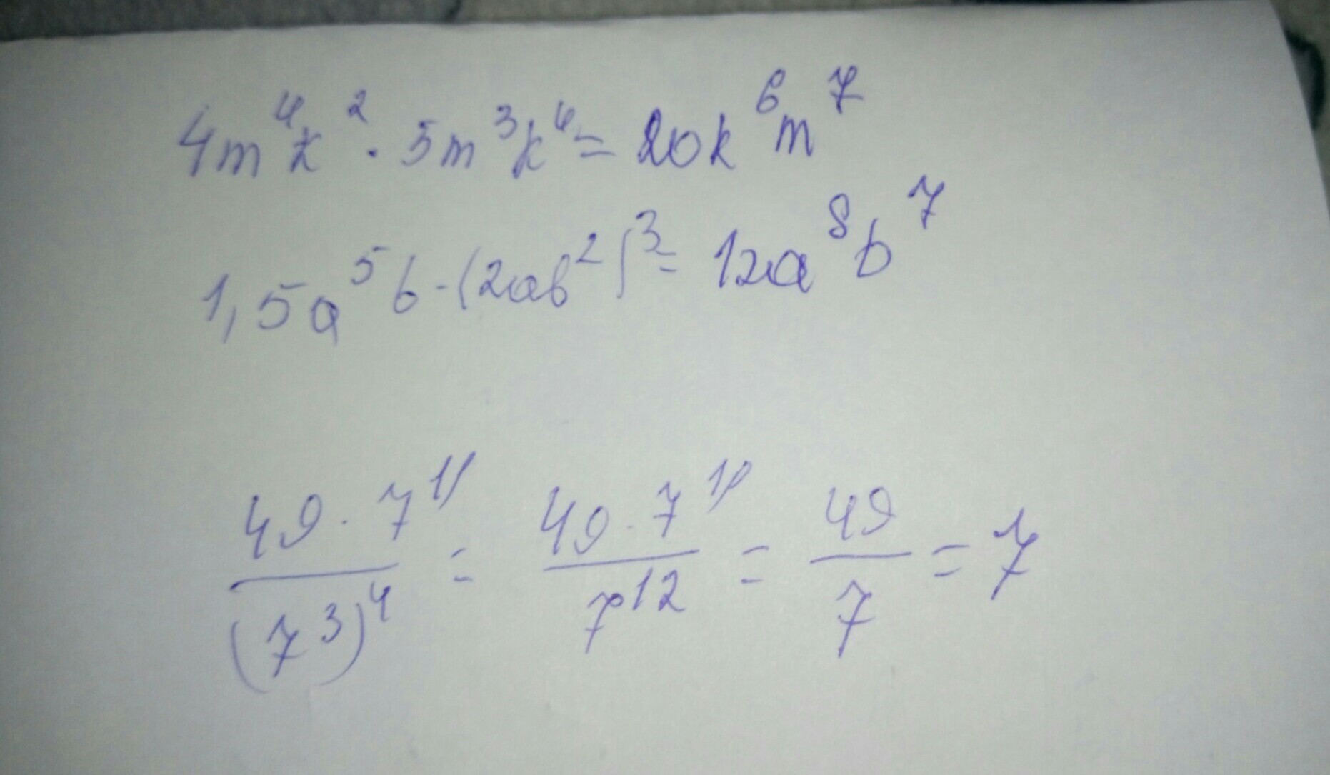 3.a)4m^4 k^2 *5m^3k^4=20m^7k^6 b)1,5a^5b*(2ab^2)^3=12 a^8 b^7 4)49*7^11 /(7^3)^4 =7^2*7^11 /7^12 =7