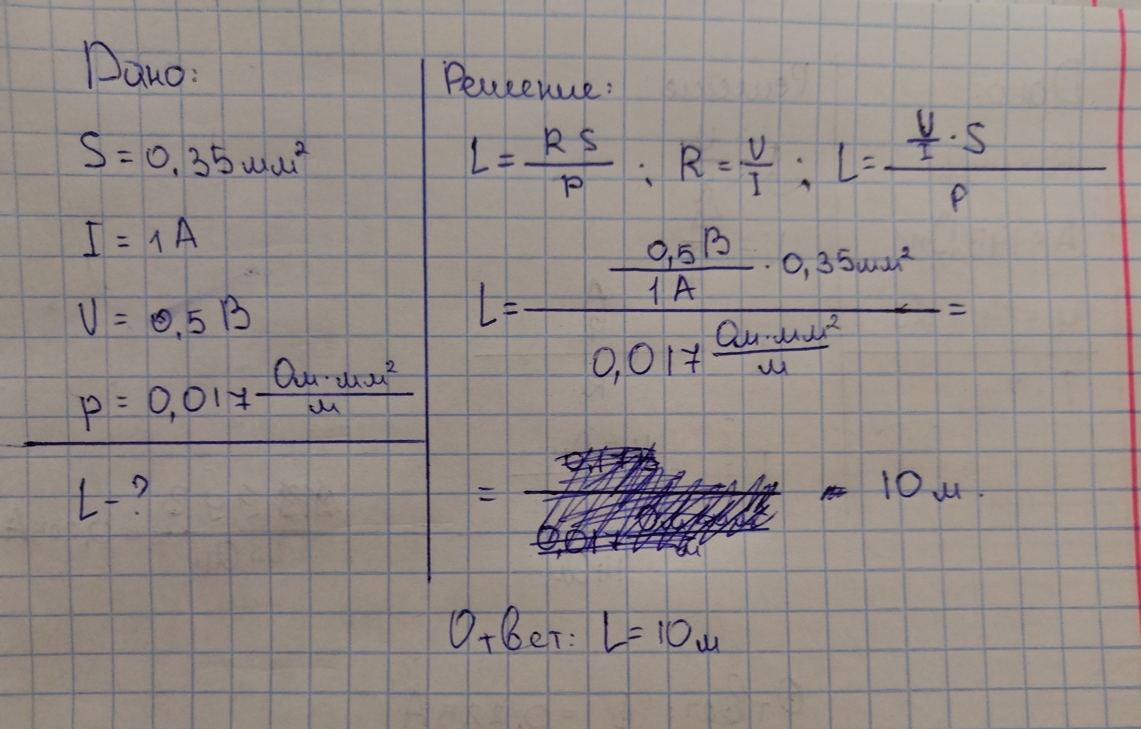 0,35 мм2 ? Сила тока, проходящего через звонок, равна 1 А., а напряжение на его концах равно 0,5 В.